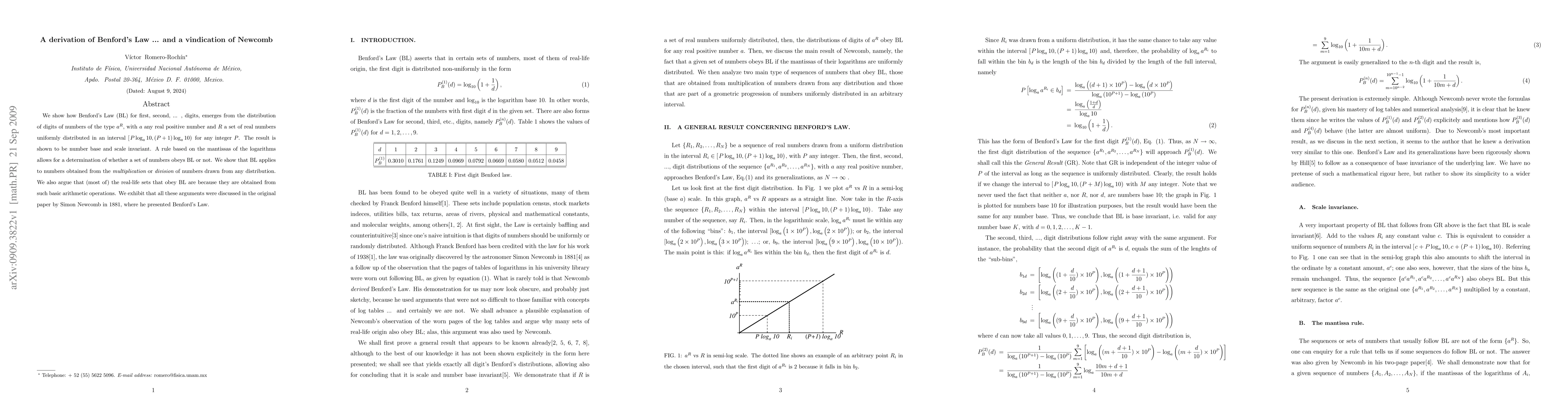 This paper derives Benford's Law from the distribution of digits in numbers generated by raising real positive numbers to random powers, showing it is scale-invariant and applies to basic arithmetic operations. The findings vindicate Simon Newcomb's original 1881 paper on the topic.