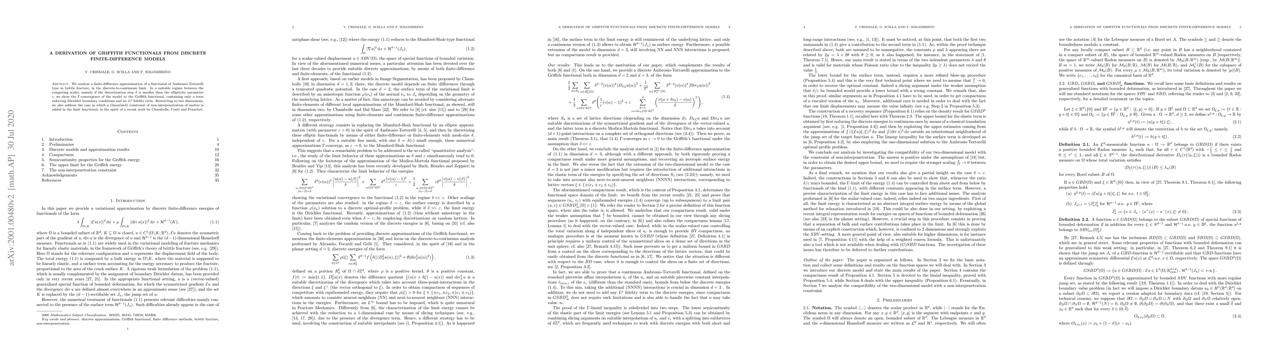 This paper derives the Griffith functional from a finite-difference approximation of Ambrosio-Tortorelli type in brittle fracture, showing $\Gamma$-convergence in the discrete-to-continuum limit when discretization is finer than the ellipticity parameter. It also considers a two-dimensional case with a non-interpenetration constraint.