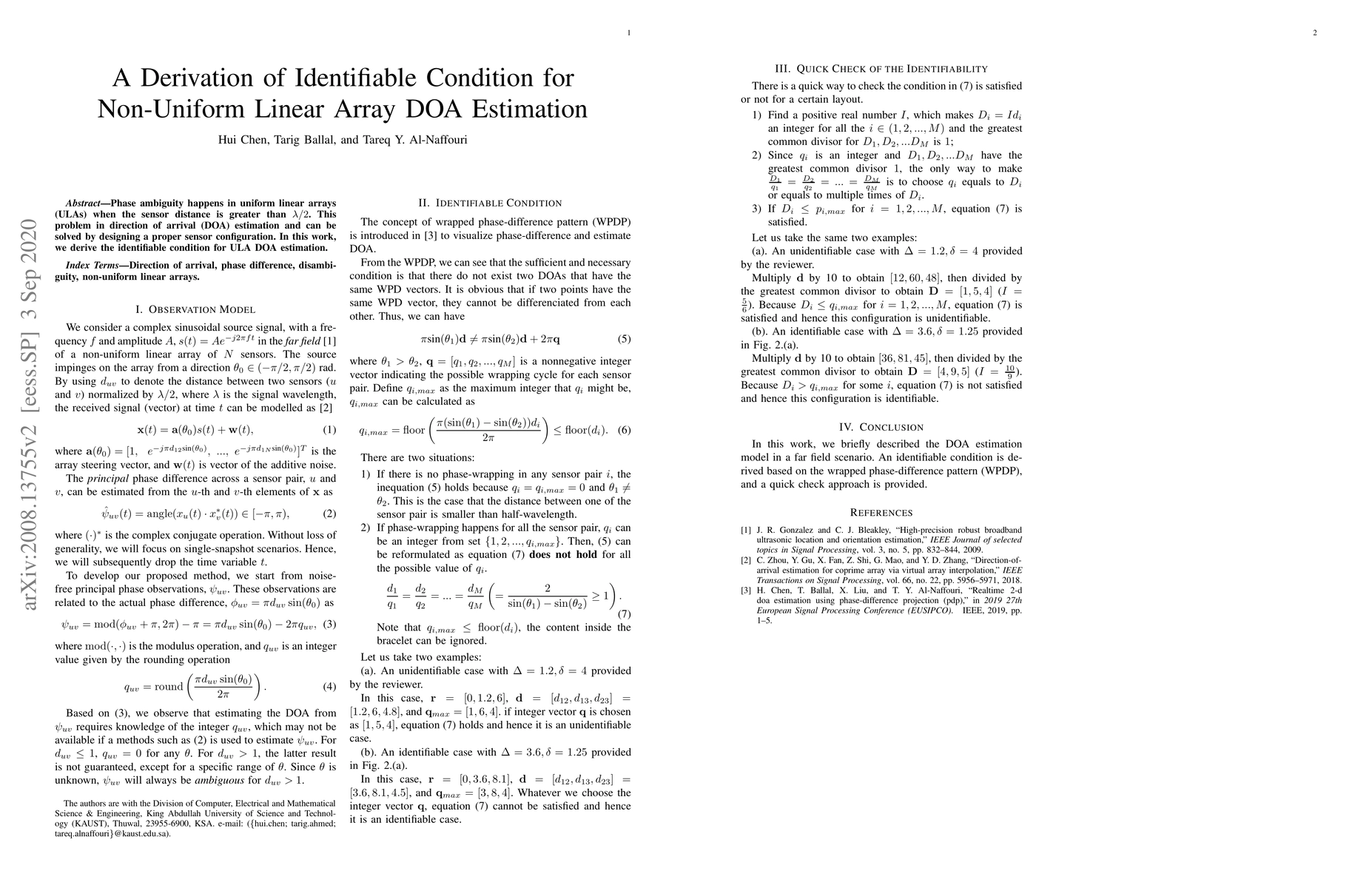 This paper derives an identifiable condition for direction of arrival (DOA) estimation in non-uniform linear arrays to address phase ambiguity issues that arise in uniform linear arrays when the sensor distance exceeds $\lambda/2$. The proposed condition aims to improve DOA estimation accuracy.