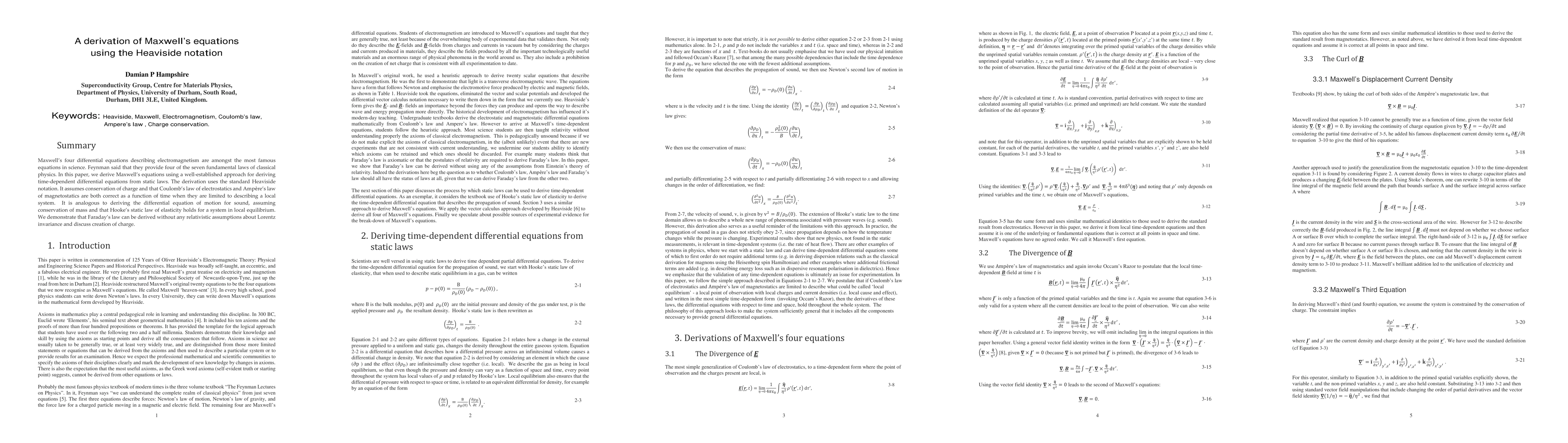 This paper derives Maxwell's equations using Heaviside notation, starting from conservation of charge and local versions of Coulomb's and Ampere's laws. It shows that Faraday's law can be derived without relativistic assumptions, emphasizing the derivation's analogy to the differential equation of sound.