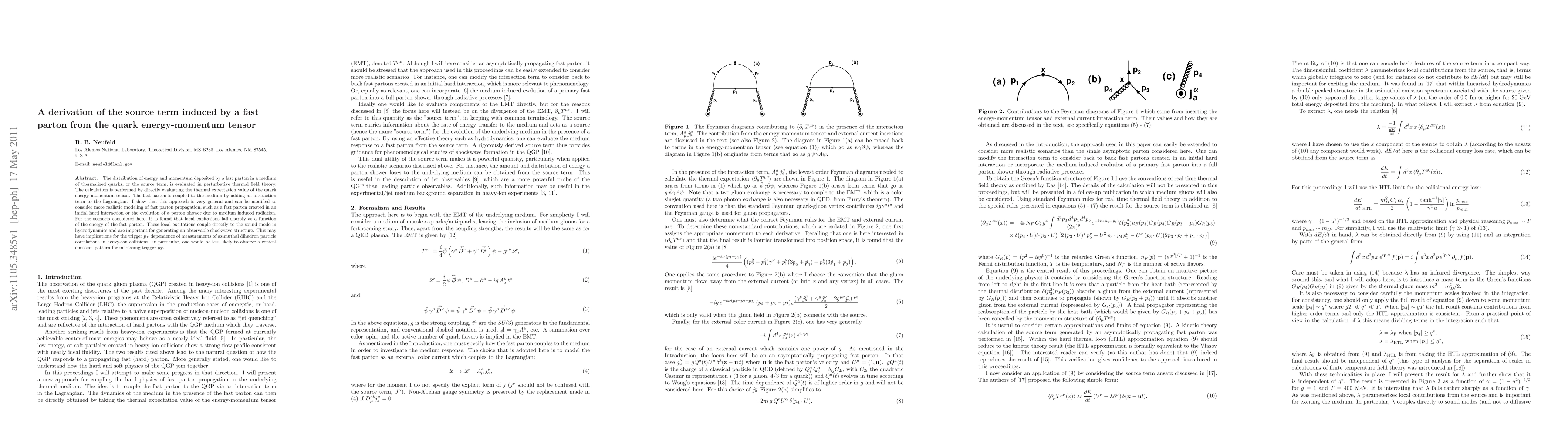 The distribution of energy and momentum deposited by a fast parton in a medium of thermalized quarks, or the source term, is evaluated in perturbative thermal field theory. The calculation is performed by directly evaluating the thermal expectation value of the quark energy-momentum tensor. The fast parton is coupled to the medium by adding an interaction term to the Lagrangian. I show that this approach is very general and can be modified to consider more realistic modeling of fast parton propagation, such as a fast parton created in an initial hard interaction or the evolution of a parton shower due to medium induced radiation. For the scenario considered here, it is found that local excitations fall sharply as a function of the energy of the fast parton. These local excitations couple directly to the sound mode in hydrodynamics and are important for generating an observable shockwave structure. This may have implications for the trigger pT dependence of measurements of azimuthal dihadron particle correlations in heavy-ion collisions. In particular, one would be less likely to observe a conical emission pattern for increasing trigger pT.