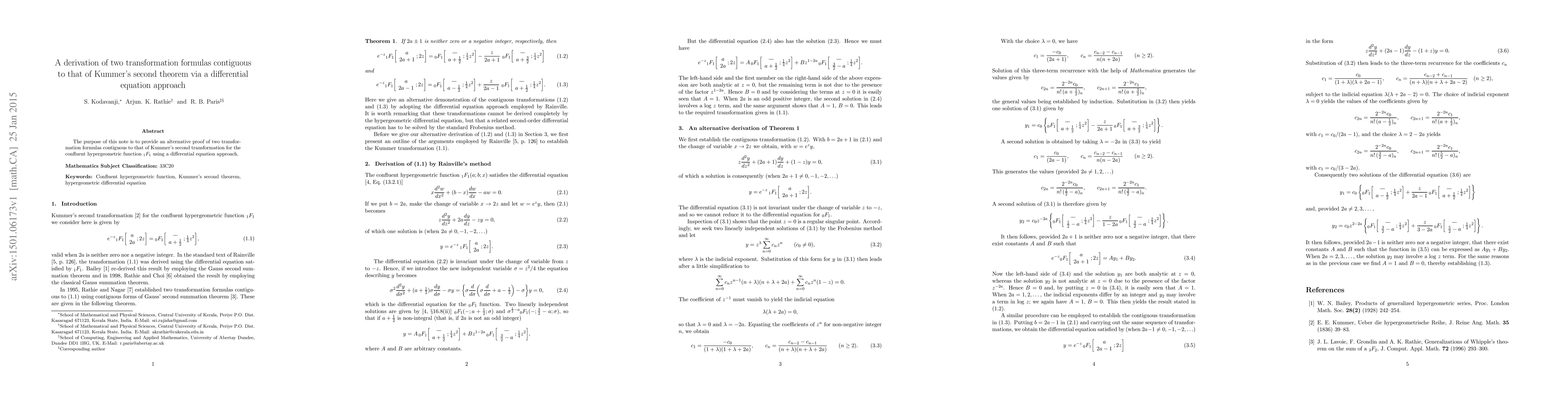 The purpose of this note is to provide an alternative proof of two transformation formulas contiguous to that of Kummer's second transformation for the confluent hypergeometric function ${}_1F_1$ using a differential equation approach.