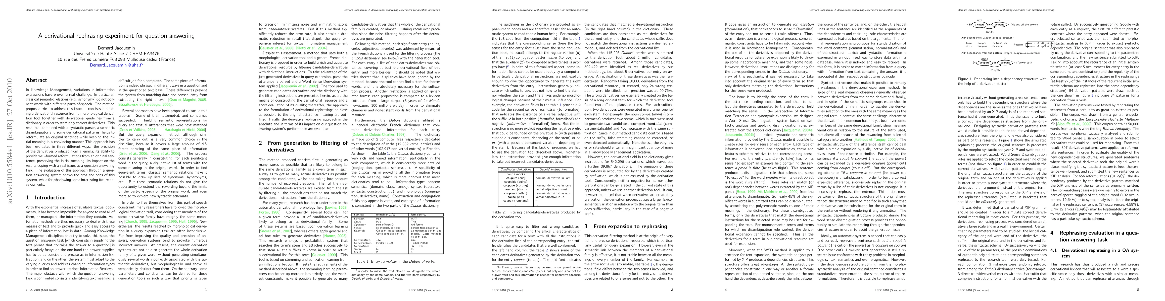 In Knowledge Management, variations in information expressions have proven a real challenge. In particular, classical semantic relations (e.g. synonymy) do not connect words with different parts-of-speech. The method proposed tries to address this issue. It consists in building a derivational resource from a morphological derivation tool together with derivational guidelines from a dictionary in order to store only correct derivatives. This resource, combined with a syntactic parser, a semantic disambiguator and some derivational patterns, helps to reformulate an original sentence while keeping the initial meaning in a convincing manner This approach has been evaluated in three different ways: the precision of the derivatives produced from a lemma; its ability to provide well-formed reformulations from an original sentence, preserving the initial meaning; its impact on the results coping with a real issue, ie a question answering task . The evaluation of this approach through a question answering system shows the pros and cons of this system, while foreshadowing some interesting future developments.
