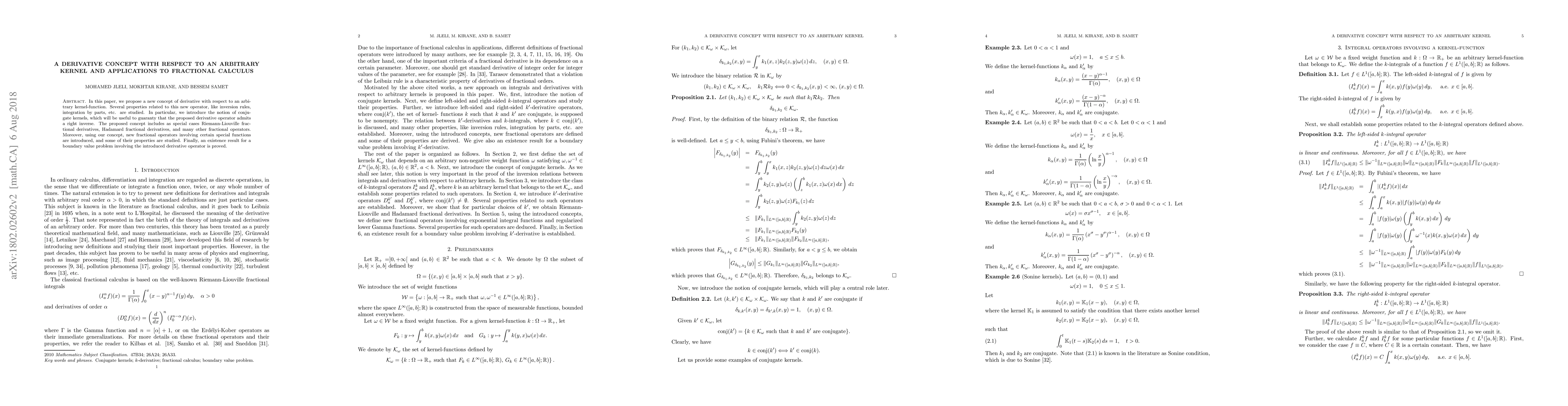 This paper introduces a novel derivative concept with respect to an arbitrary kernel function, exploring properties such as inversion rules and integration by parts. It includes special cases like Riemann-Liouville and Hadamard fractional derivatives and introduces new fractional operators involving special functions, concluding with a proof of existence for a boundary value problem.