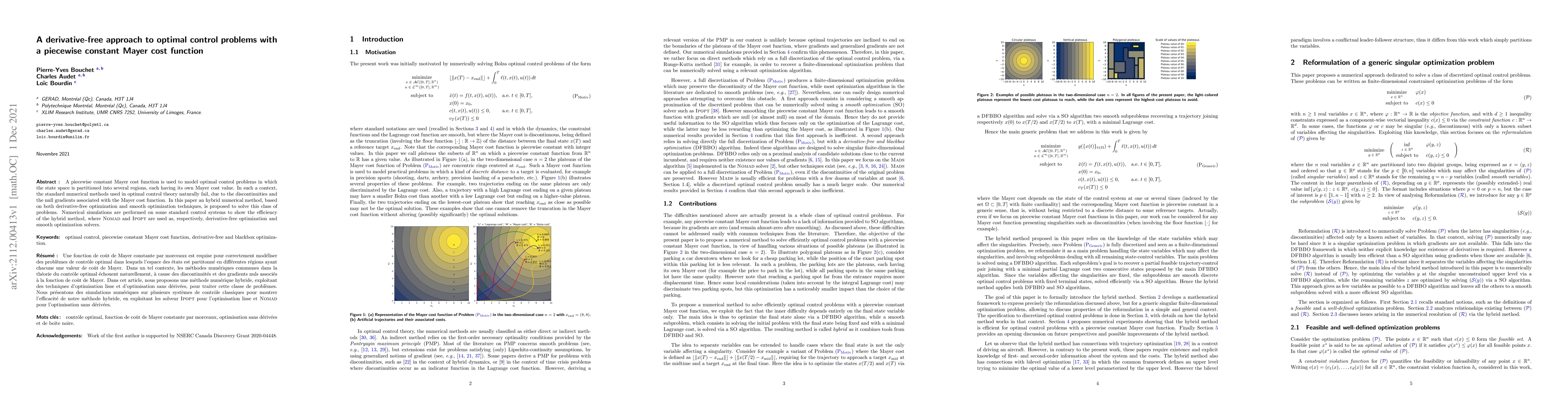A piecewise constant Mayer cost function is used to model optimal control problems in which the state space is partitioned into several regions, each having its own Mayer cost value. In such a context, the standard numerical methods used in optimal control theory naturally fail, due to the discontinuities and the null gradients associated with the Mayer cost function. In this paper an hybrid numerical method, based on both derivative-free optimization and smooth optimization techniques, is proposed to solve this class of problems. Numerical simulations are performed on some standard control systems to show the efficiency of the hybrid method, where NOMAD and IPOPT are used as, respectively, derivative-free optimization and smooth optimization solvers.