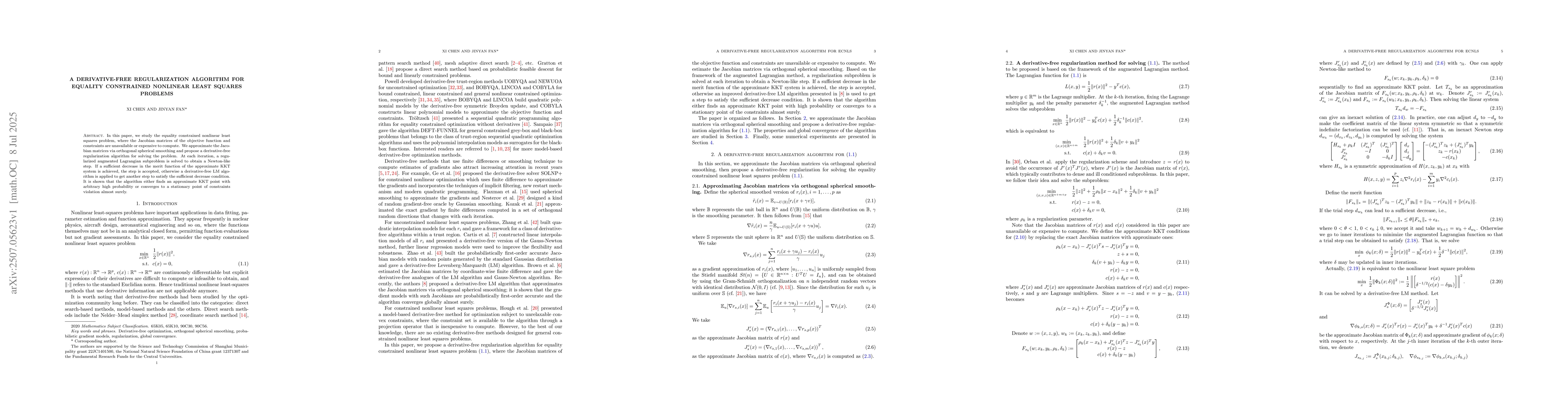 In this paper, we study the equality constrained nonlinear least squares problem, where the Jacobian matrices of the objective function and constraints are unavailable or expensive to compute. We approximate the Jacobian matrices via orthogonal spherical smoothing and propose a derivative-free regularization algorithm for solving the problem. At each iteration, a regularized augmented Lagrangian subproblem is solved to obtain a Newton-like step. If a sufficient decrease in the merit function of the approximate KKT system is achieved, the step is accepted, otherwise a derivative-free LM algorithm is applied to get another step to satisfy the sufficient decrease condition. It is shown that the algorithm either finds an approximate KKT point with arbitrary high probability or converges to a stationary point of constraints violation almost surely.