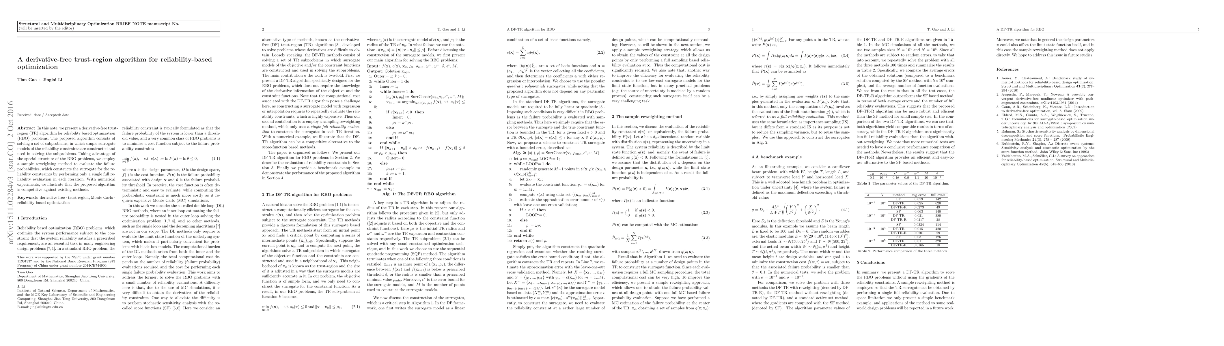In this note, we present a derivative-free trust-region (TR) algorithm for reliability based optimization (RBO) problems. The proposed algorithm consists of solving a set of subproblems, in which simple surrogate models of the reliability constraints are constructed and used in solving the subproblems. Taking advantage of the special structure of the RBO problems, we employ a sample reweighting method to evaluate the failure probabilities, which constructs the surrogate for the reliability constraints by performing only a single full reliability evaluation in each iteration. With numerical experiments, we illustrate that the proposed algorithm is competitive against existing methods.