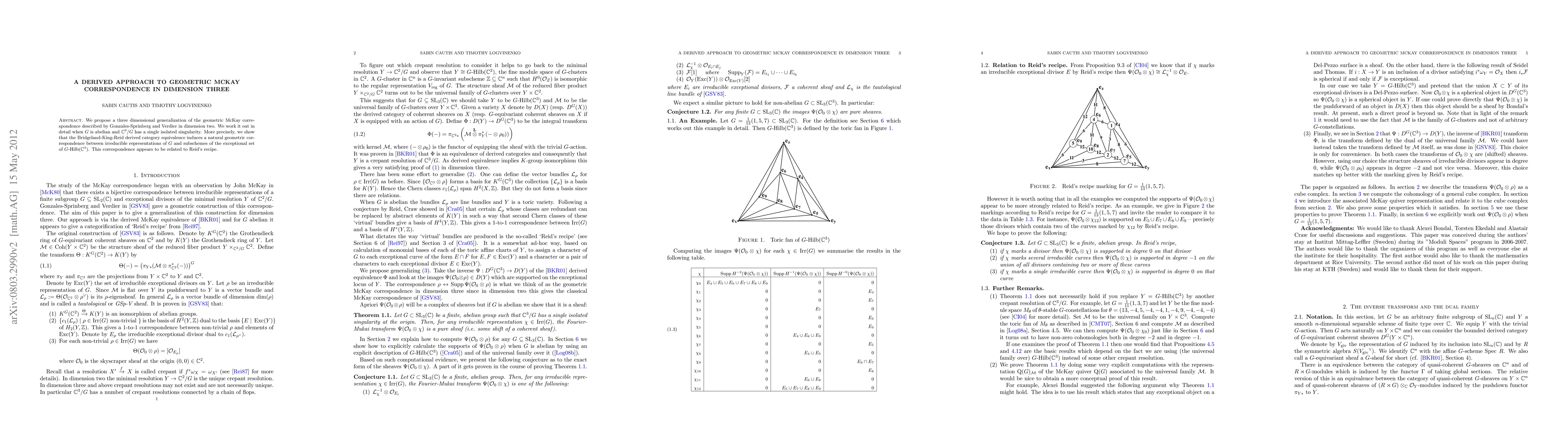 We propose a three dimensional generalization of the geometric McKay correspondence described by Gonzales-Sprinberg and Verdier in dimension two. We work it out in detail when G is abelian and C^3/G has a single isolated singularity. More precisely, we show that the Bridgeland-King-Reid derived category equivalence induces a natural geometric correspondence between irreducible representations of G and subschemes of the exceptional set of G-Hilb (C^3). This correspondence appears to be related to Reid's recipe.