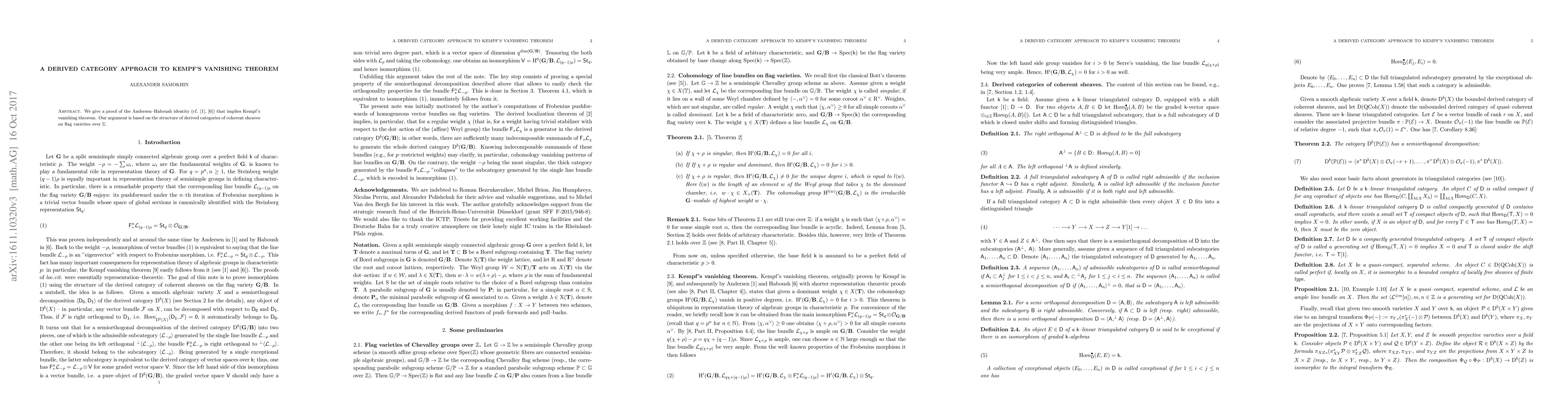 We give a proof of the Andersen-Haboush identity that implies Kempf's vanishing theorem. Our argument is based on the structure of derived categories of coherent sheaves on flag varieties over $\mathbb Z$.