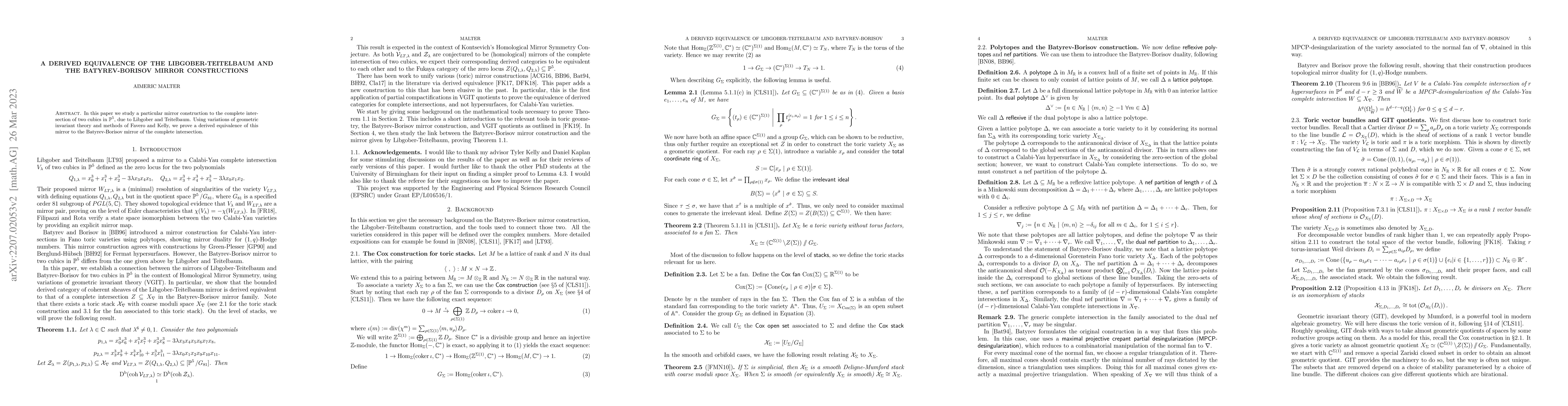 This paper establishes a derived equivalence between the Libgober-Teitelbaum mirror construction for a complete intersection of two cubics in $\mathbb{P}^5$ and the Batyrev-Borisov mirror construction, utilizing geometric invariant theory and methods from Favero and Kelly.