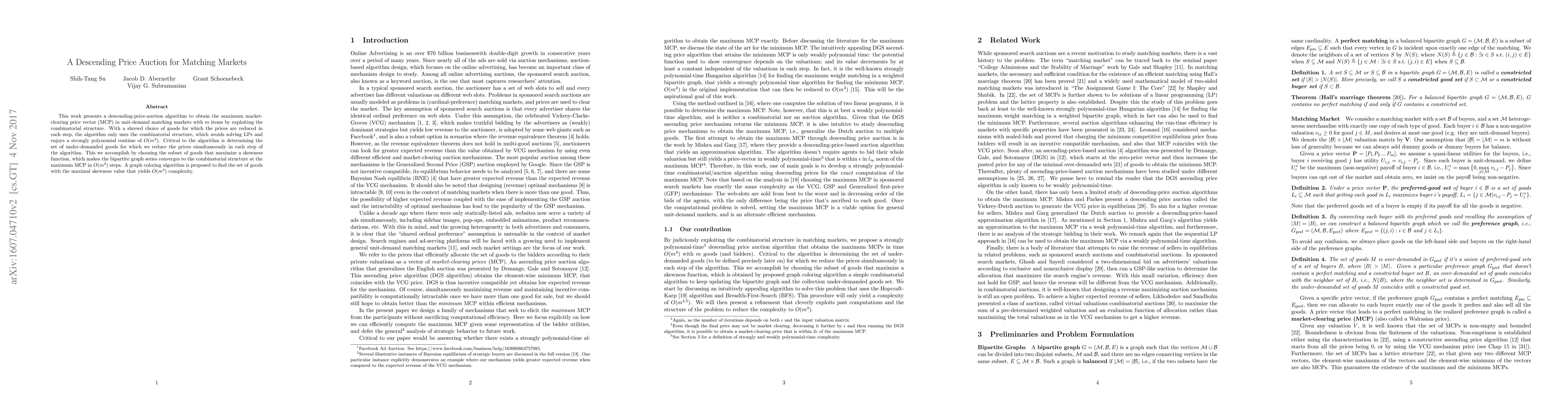 A new algorithm uses a descending-price auction to find the maximum market-clearing price in matching markets, achieving a strongly polynomial runtime of O(m^4) without solving linear programs.