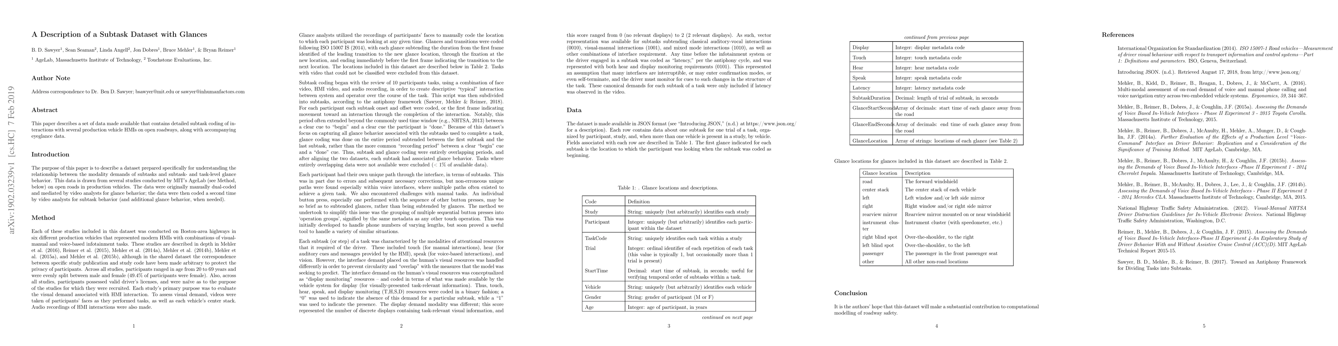 This paper describes a set of data made available that contains detailed subtask coding of interactions with several production vehicle human machine interfaces (HMIs) on open roadways, along with accompanying eyeglance data.