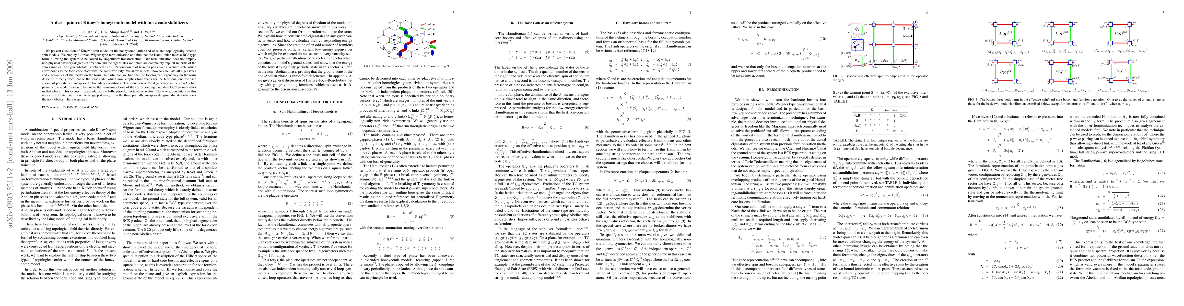 The paper presents a solution for Kitaev's spin model on a honeycomb lattice using a Jordan-Wigner fermionization, resulting in a BCS-type Hamiltonian. The ground state is described as a BCS condensate of fermion pairs over a toric code state, with explicit eigenstates and eigenvalues calculated on the torus. The topological degeneracy originates from the toric code's vacua, and the reduction of degeneracy in the non-Abelian phase is attributed to the vanishing of one BCS ground-state in that phase.