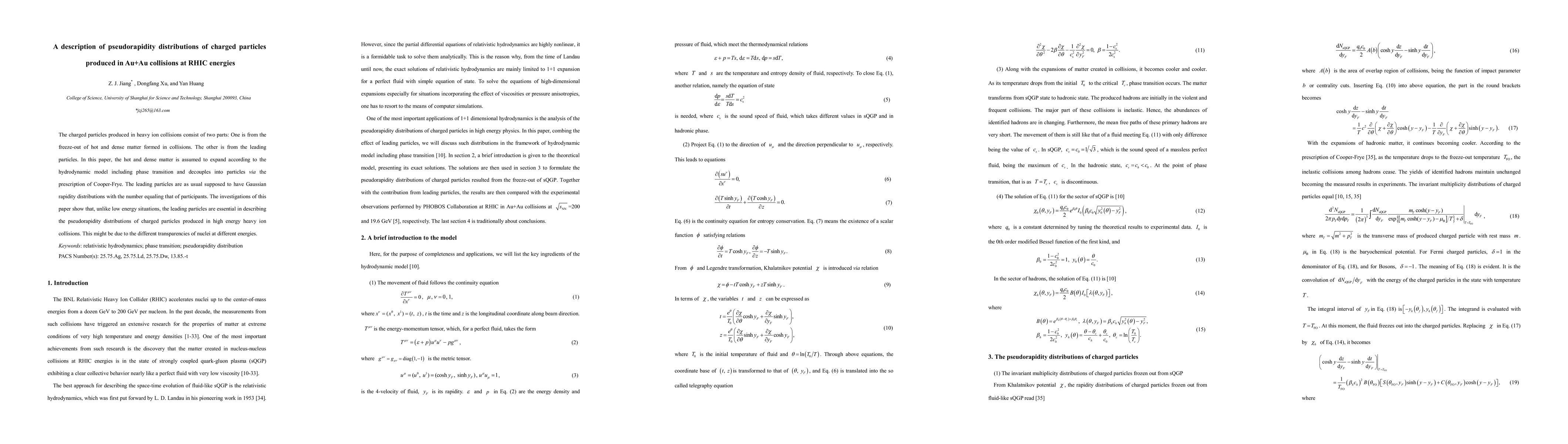 The charged particles produced in heavy ion collisions consist of two parts: One is from the freeze-out of hot and dense matter formed in collisions. The other is from the leading particles. In this paper, the hot and dense matter is assumed to expand according to the hydrodynamic model including phase transition and decouples into particles via the prescription of Cooper-Frye. The leading particles are as usual supposed to have Gaussian rapidity distributions with the number equaling that of participants. The investigations of this paper show that, unlike low energy situations, the leading particles are essential in describing the pseudorapidity distributions of charged particles produced in high energy heavy ion collisions. This might be due to the different transparencies of nuclei at different energies.