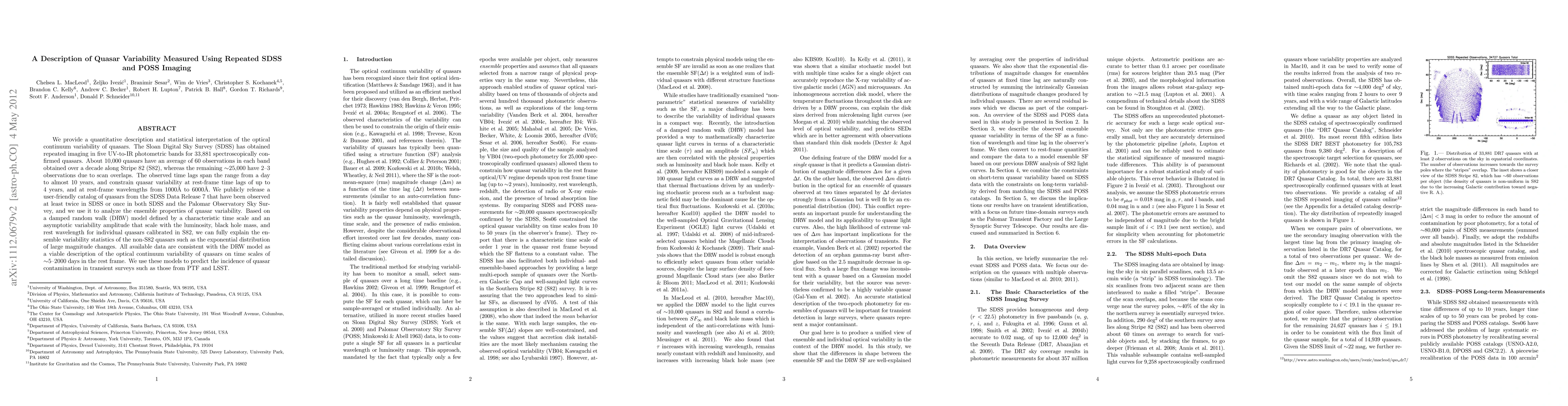 This paper quantitatively analyzes the optical variability of 33,881 quasars using repeated SDSS and POSS imaging, revealing time lags from days to nearly 10 years. A damped random walk model explains the observed variability, predicting quasar contamination in future transient surveys.