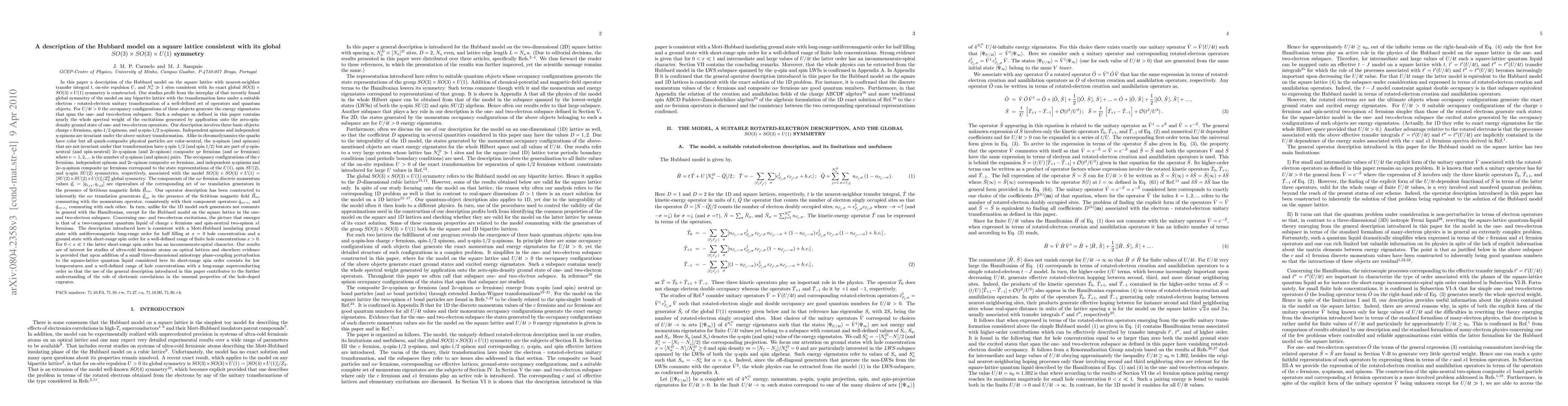In this paper a description of the Hubbard model on the square lattice with nearest-neighbor transfer integral $t$, on-site repulsion $U$, and $N_a^2\gg 1$ sites consistent with its exact global $SO(3)\times SO(3)\times U(1)$ symmetry is constructed. Our studies profit from the interplay of that recently found global symmetry of the model on any bipartite lattice with the transformation laws under a suitable electron - rotated-electron unitary transformation of a well-defined set of operators and quantum objects. For $U/4t>0$ the occupancy configurations of these objects generate the energy eigenstates that span the one- and two-electron subspace. Such a subspace as defined in this paper contains nearly the whole spectral weight of the excitations generated by application onto the zero-spin-density ground state of one- and two-electron operators. Our description involves three basic objects: charge $c$ fermions, spin-1/2 spinons, and $\eta$-spin-1/2 $\eta$-spinons. Alike in chromodynamics the quarks have color but all quark-composite physical particles are color-neutral, the $\eta$-spinon (and spinons) that are not invariant under that transformation have $\eta$ spin 1/2 (and spin 1/2) but are part of $\eta$-spin-neutral (and spin-neutral) $2\nu$-$\eta$-spinon (and $2\nu$-spinon) composite $\eta\nu$ fermions (and $s\nu$ fermions) where $\nu=1,2,...$ is the number of $\eta$-spinon (and spinon) pairs.The description introduced here is consistent with a Mott-Hubbard insulating ground state with antiferromagnetic long-range order for half filling at $x=0$ hole concentration and a ground state with short-range spin order for a well-defined range of finite hole concentrations $x>0$.