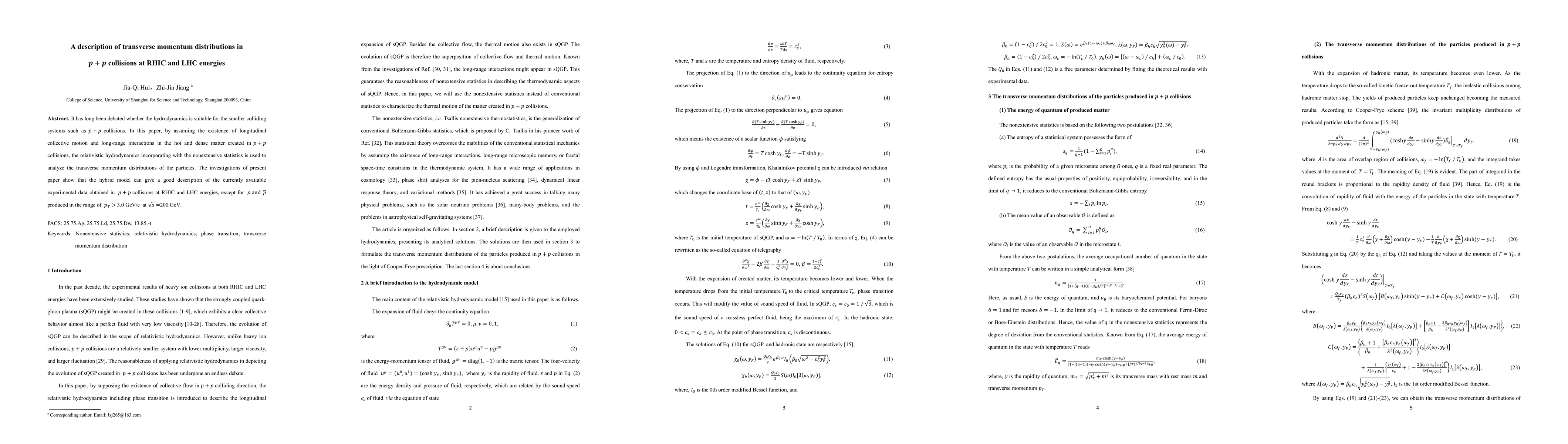 It has long been debated whether the hydrodynamics is suitable for the smaller colliding systems such as p+p collisions. In this paper, by assuming the existence of longitudinal collective motion and long-range interactions in the hot and dense matter created in p+p collisions, the relativistic hydrodynamics incorporating with the nonextensive statistics is used to analyze the transverse momentum distributions of the particles. The investigations of present paper show that the hybrid model can give a good description of the currently available experimental data obtained in p+p collisions at RHIC and LHC energies, except for p and p^bar produced in the range of p_T> 3.0 GeV/c at sqrt(s)=200 GeV.
