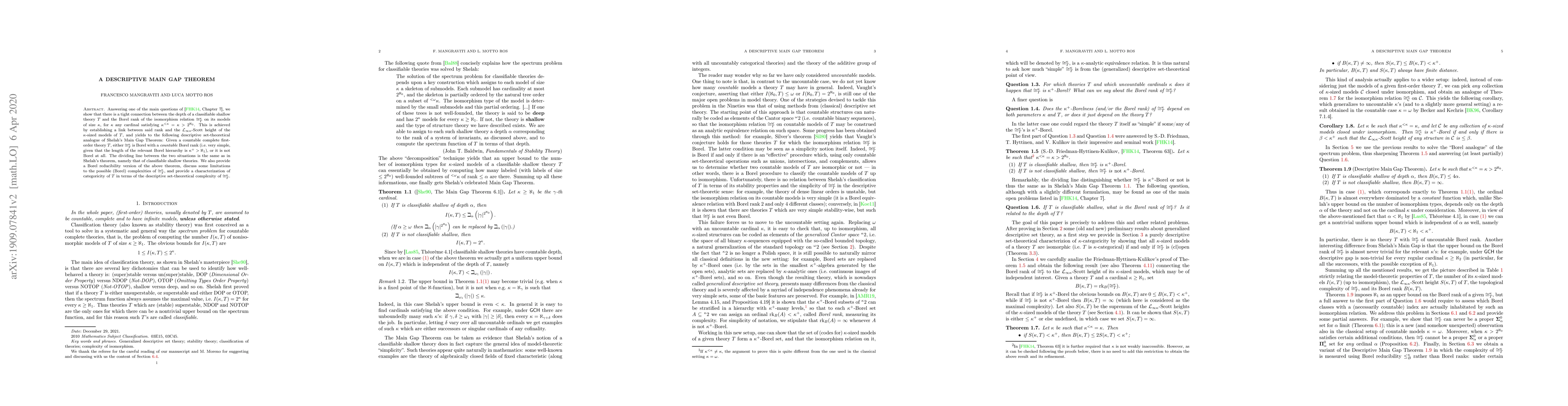 Answering one of the main questions of [FHK14, Chapter 7], we show that there is a tight connection between the depth of a classifiable shallow theory $T$ and the Borel rank of the isomorphism relation $\cong^\kappa_T$ on its models of size $\kappa$, for $\kappa$ any cardinal satisfying $\kappa^{< \kappa} = \kappa > 2^{\aleph_0}$. This is achieved by establishing a link between said rank and the $\mathcal{L}_{\infty \kappa}$-Scott height of the $\kappa$-sized models of $T$, and yields to the following descriptive set-theoretical analogue of Shelah's Main Gap Theorem: Given a countable complete first-order theory $T$, either $\cong^\kappa_T$ is Borel with a countable Borel rank (i.e. very simple, given that the length of the relevant Borel hierarchy is $\kappa^+ > \aleph_1$), or it is not Borel at all. The dividing line between the two situations is the same as in Shelah's theorem, namely that of classifiable shallow theories. We also provide a Borel reducibility version of the above theorem, discuss some limitations to the possible (Borel) complexities of $\cong^\kappa_T$, and provide a characterization of categoricity of $T$ in terms of the descriptive set-theoretical complexity of $\cong^\kappa_T$.