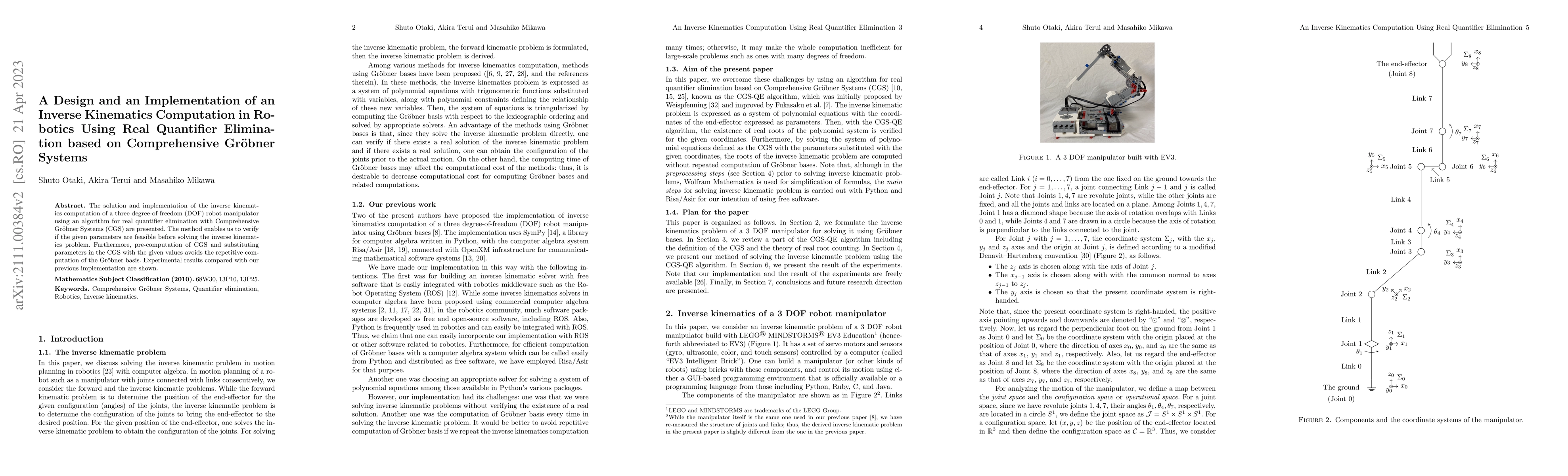 This paper presents an inverse kinematics computation for a three-DOF robot manipulator using real quantifier elimination with Comprehensive Gröbner Systems (CGS). The method verifies parameter feasibility and reduces repetitive computation by pre-computing CGS, showing improved results compared to previous implementations.