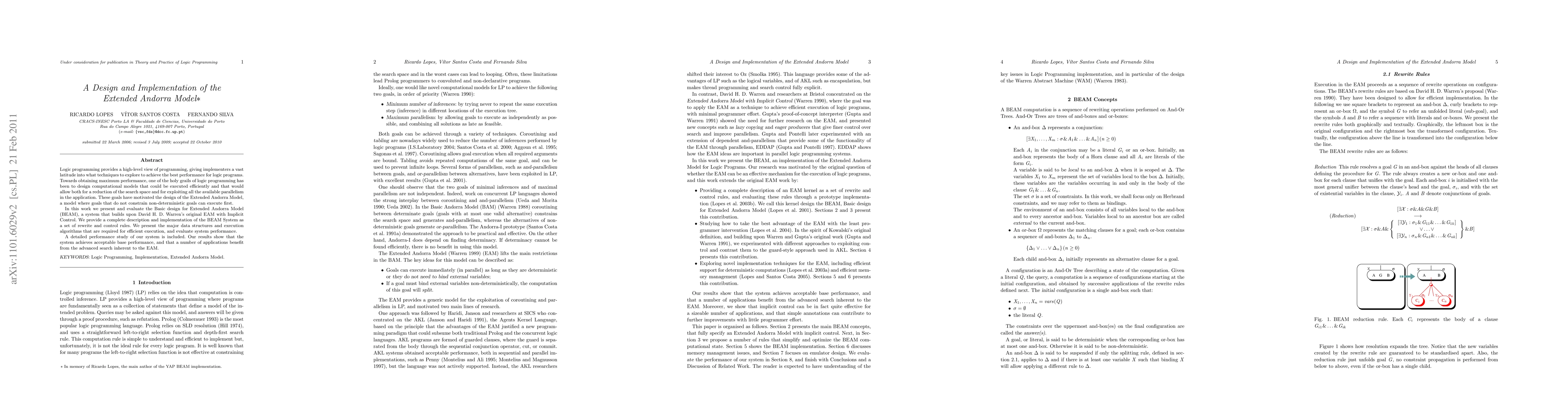 Logic programming provides a high-level view of programming, giving implementers a vast latitude into what techniques to explore to achieve the best performance for logic programs. Towards obtaining maximum performance, one of the holy grails of logic programming has been to design computational models that could be executed efficiently and that would allow both for a reduction of the search space and for exploiting all the available parallelism in the application. These goals have motivated the design of the Extended Andorra Model, a model where goals that do not constrain non-deterministic goals can execute first. In this work we present and evaluate the Basic design for Extended Andorra Model (BEAM), a system that builds upon David H. D. Warren's original EAM with Implicit Control. We provide a complete description and implementation of the BEAM System as a set of rewrite and control rules. We present the major data structures and execution algorithms that are required for efficient execution, and evaluate system performance. A detailed performance study of our system is included. Our results show that the system achieves acceptable base performance, and that a number of applications benefit from the advanced search inherent to the EAM.