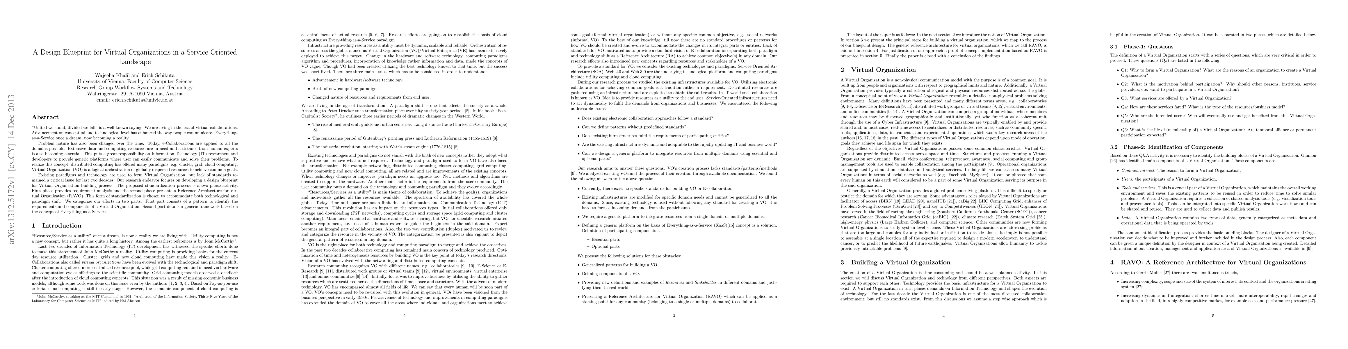 "United we stand, divided we fall" is a well known saying. We are living in the era of virtual collaborations. Advancement on conceptual and technological level has enhanced the way people communicate. Everything-as-a-Service once a dream, now becoming a reality. Problem nature has also been changed over the time. Today, e-Collaborations are applied to all the domains possible. Extensive data and computing resources are in need and assistance from human experts is also becoming essential. This puts a great responsibility on Information Technology (IT) researchers and developers to provide generic platforms where user can easily communicate and solve their problems. To realize this concept, distributed computing has offered many paradigms, e.g. cluster, grid, cloud computing. Virtual Organization (VO) is a logical orchestration of globally dispersed resources to achieve common goals. Existing paradigms and technology are used to form Virtual Organization, but lack of standards remained a critical issue for last two decades. Our research endeavor focuses on developing a design blueprint for Virtual Organization building process. The proposed standardization process is a two phase activity. First phase provides requirement analysis and the second phase presents a Reference Architecture for Virtual Organization (RAVO). This form of standardization is chosen to accommodate both technological and paradigm shift. We categorize our efforts in two parts. First part consists of a pattern to identify the requirements and components of a Virtual Organization. Second part details a generic framework based on the concept of Everything-as-a-Service.