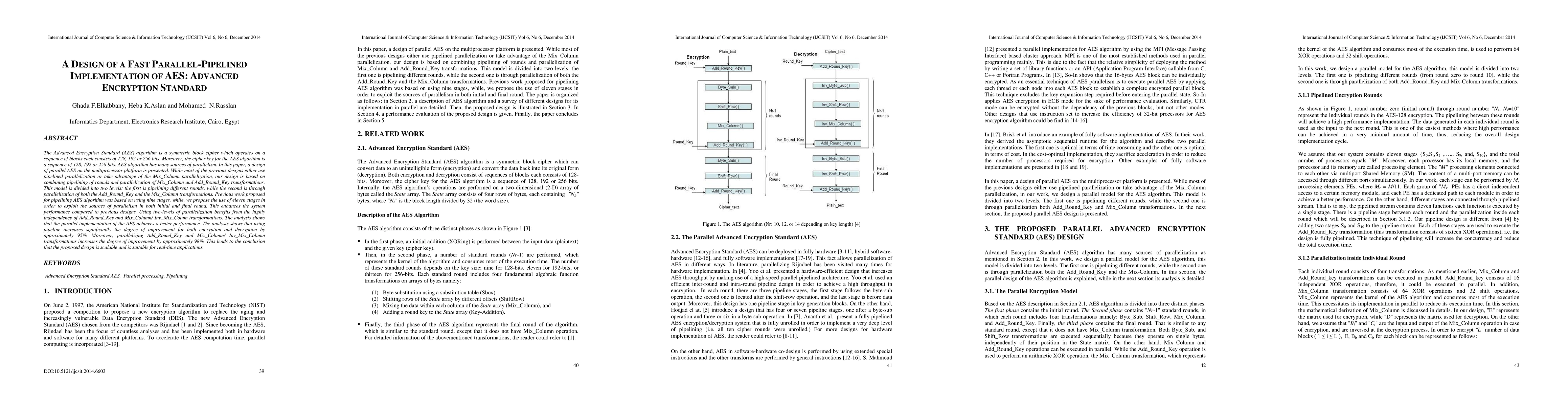 The Advanced Encryption Standard (AES) algorithm is a symmetric block cipher which operates on a sequence of blocks each consists of 128, 192 or 256 bits. Moreover, the cipher key for the AES algorithm is a sequence of 128, 192 or 256 bits. AES algorithm has many sources of parallelism. In this paper, a design of parallel AES on the multiprocessor platform is presented. While most of the previous designs either use pipelined parallelization or take advantage of the Mix_Column parallelization, our design is based on combining pipelining of rounds and parallelization of Mix_Column and Add_Round_Key transformations. This model is divided into two levels: the first is pipelining different rounds, while the second is through parallelization of both the Add_Round_Key and the Mix_Column transformations. Previous work proposed for pipelining AES algorithm was based on using nine stages, while, we propose the use of eleven stages in order to exploit the sources of parallelism in both initial and final round. This enhances the system performance compared to previous designs. Using two-levels of parallelization benefits from the highly independency of Add_Round_Key and Mix_Column/ Inv_Mix_Colum transformations. The analysis shows that the parallel implementation of the AES achieves a better performance. The analysis shows that using pipeline increases significantly the degree of improvement for both encryption and decryption by approximately 95%. Moreover, parallelizing Add_Round_Key and Mix_Column/ Inv_Mix_Column transformations increases the degree of improvement by approximately 98%. This leads to the conclusion that the proposed design is scalable and is suitable for real-time applications.
