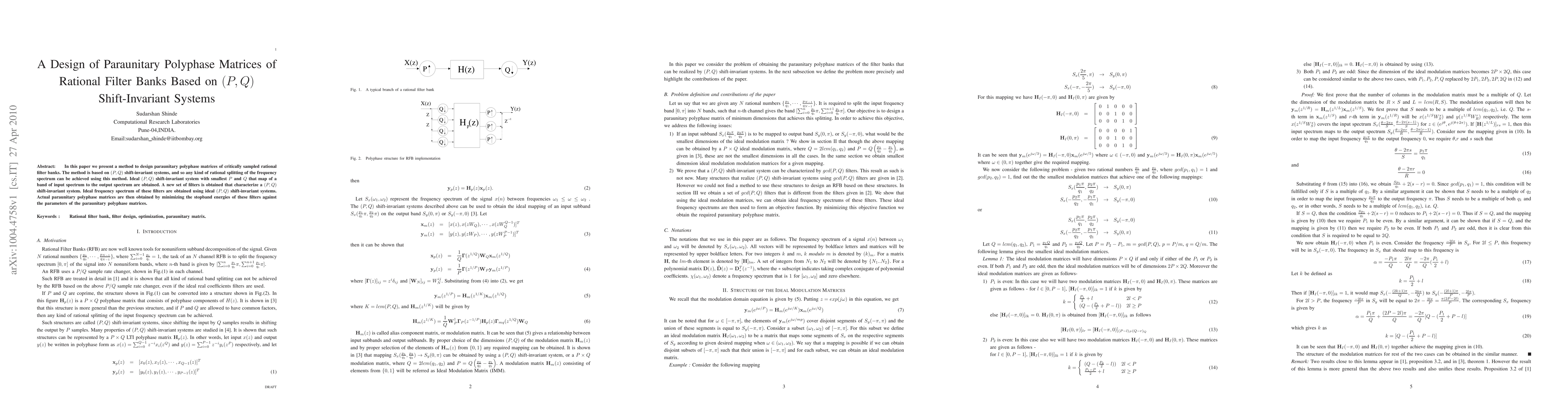 In this paper we present a method to design paraunitary polyphase matrices of critically sampled rational filter banks. The method is based on (P,Q) shift-invariant systems, and so any kind of rational splitting of the frequency spectrum can be achieved using this method. Ideal (P,Q) shift-invariant system with smallest P and Q that map of a band of input spectrum to the output spectrum are obtained. A new set of filters is obtained that characterize a (P,Q) shift-invariant system. Ideal frequency spectrum of these filters are obtained using ideal $(P,Q)$ shift-invariant systems. Actual paraunitary polyphase matrices are then obtained by minimizing the stopband energies of these filters against the parameters of the paraunitary polyphase matrices.