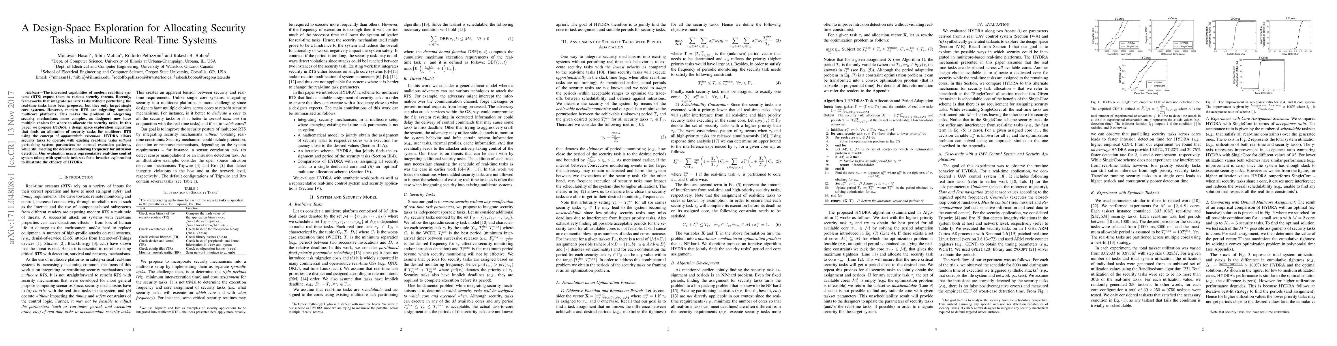 This paper proposes HYDRA, a design space exploration algorithm for allocating security tasks in multicore real-time systems (RTS) using opportunistic execution. HYDRA aims to integrate security mechanisms without disrupting real-time task execution, ensuring intrusion detection monitoring frequency is maintained.
