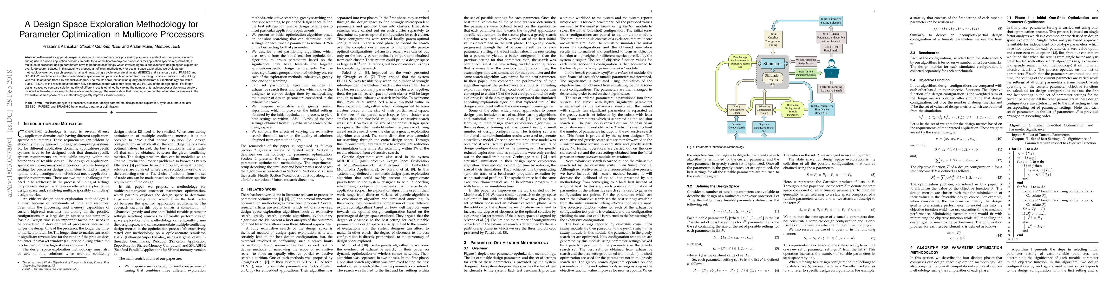This paper proposes an efficient methodology for optimizing design parameters in multicore processors through design space exploration. The methodology is evaluated using PARSEC and SPLASH-2 benchmarks, showing comparable results to exhaustive search while exploring much smaller portions of the design space, thus significantly reducing computational effort.