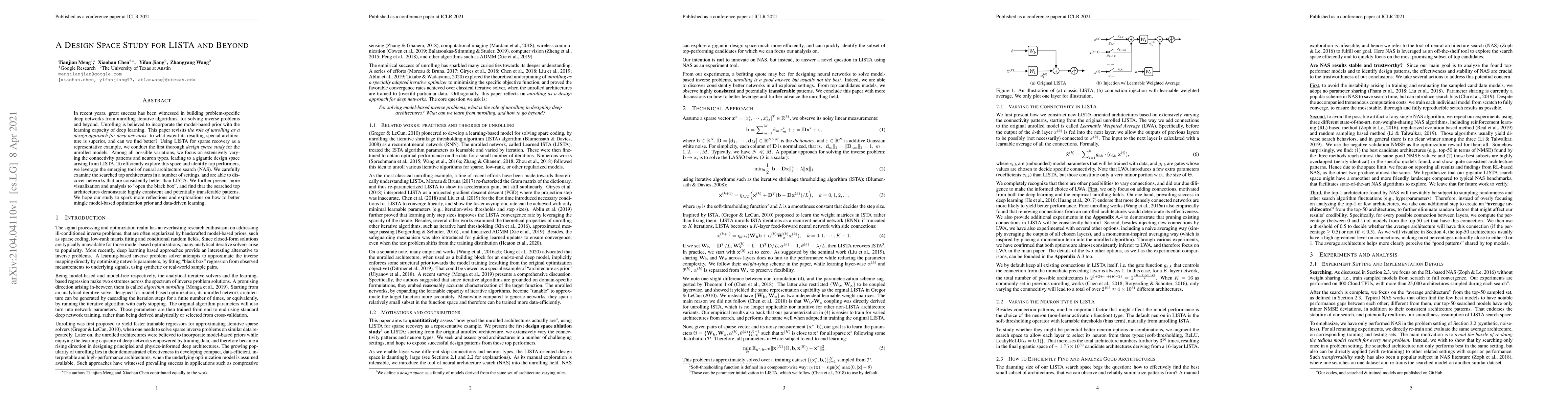 In recent years, great success has been witnessed in building problem-specific deep networks from unrolling iterative algorithms, for solving inverse problems and beyond. Unrolling is believed to incorporate the model-based prior with the learning capacity of deep learning. This paper revisits the role of unrolling as a design approach for deep networks: to what extent its resulting special architecture is superior, and can we find better? Using LISTA for sparse recovery as a representative example, we conduct the first thorough design space study for the unrolled models. Among all possible variations, we focus on extensively varying the connectivity patterns and neuron types, leading to a gigantic design space arising from LISTA. To efficiently explore this space and identify top performers, we leverage the emerging tool of neural architecture search (NAS). We carefully examine the searched top architectures in a number of settings, and are able to discover networks that are consistently better than LISTA. We further present more visualization and analysis to "open the black box", and find that the searched top architectures demonstrate highly consistent and potentially transferable patterns. We hope our study to spark more reflections and explorations on how to better mingle model-based optimization prior and data-driven learning.