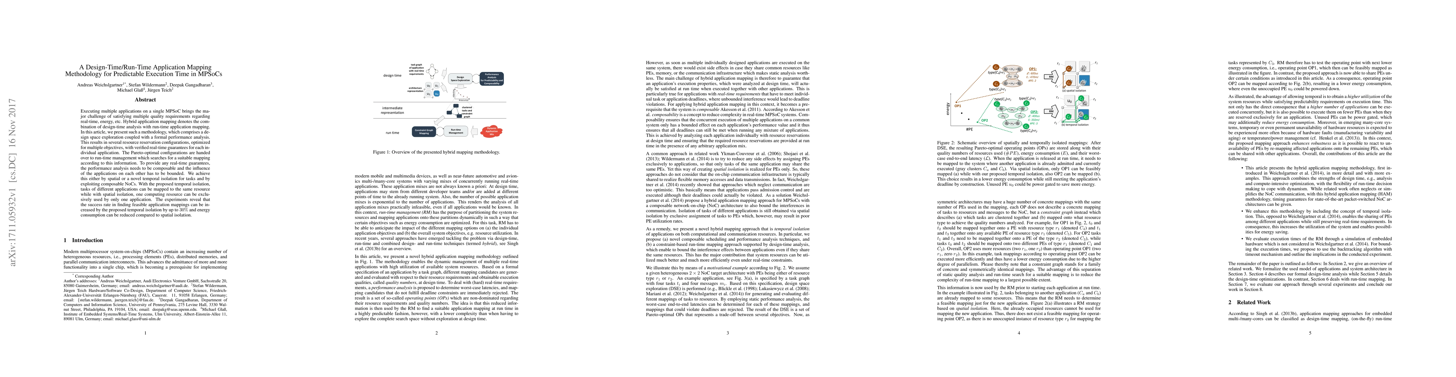 This paper proposes a hybrid design-time/run-time application mapping methodology for Multi-Processor System-on-Chips (MPSoCs) to optimize execution time and satisfy multiple quality requirements. The methodology combines design space exploration with formal performance analysis to achieve Pareto-optimal configurations, enhancing real-time guarantees and reducing energy consumption by up to 30% through temporal isolation.