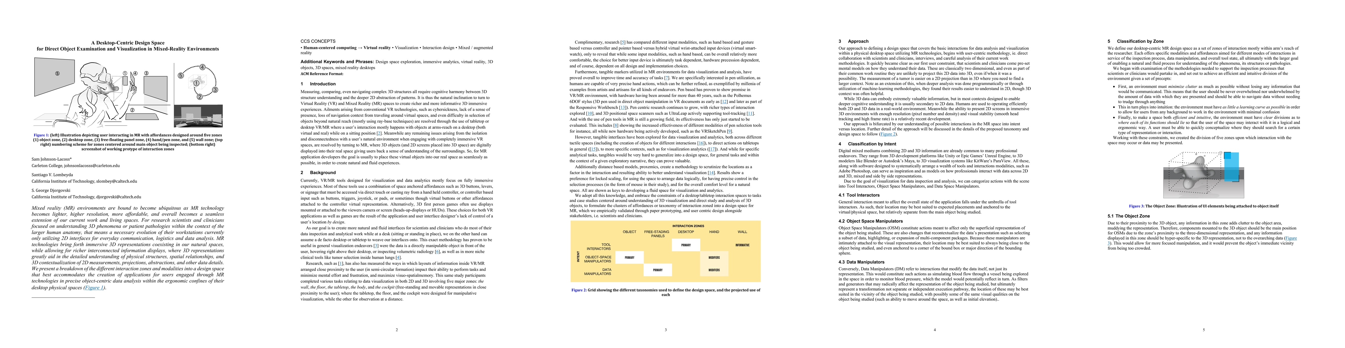Mixed reality (MR) environments are bound to become ubiquitous as MR technology becomes lighter, higher resolution, more affordable, and overall becomes a seamless extension of our current work and living spaces. For research scientists and clinicians focused on understanding 3D phenomena or patient pathologies within the context of the larger human anatomy, that means a necessary evolution of their workstations currently only utilizing 2D interfaces for everyday communication, logistics and data analysis. MR technologies bring forth immersive 3D representations coexisting in our natural spaces, while allowing for richer interconnected information displays, where 3D representations greatly aid in the detailed understanding of physical structures, spatial relationships, and 3D contextualization of 2D measurements, projections, abstractions, and other data details. We present a breakdown of the different interaction zones and modalities into a design space that best accommodates the creation of applications for users engaged through MR technologies in precise object-centric data analysis within the ergonomic confines of their desktop physical spaces.