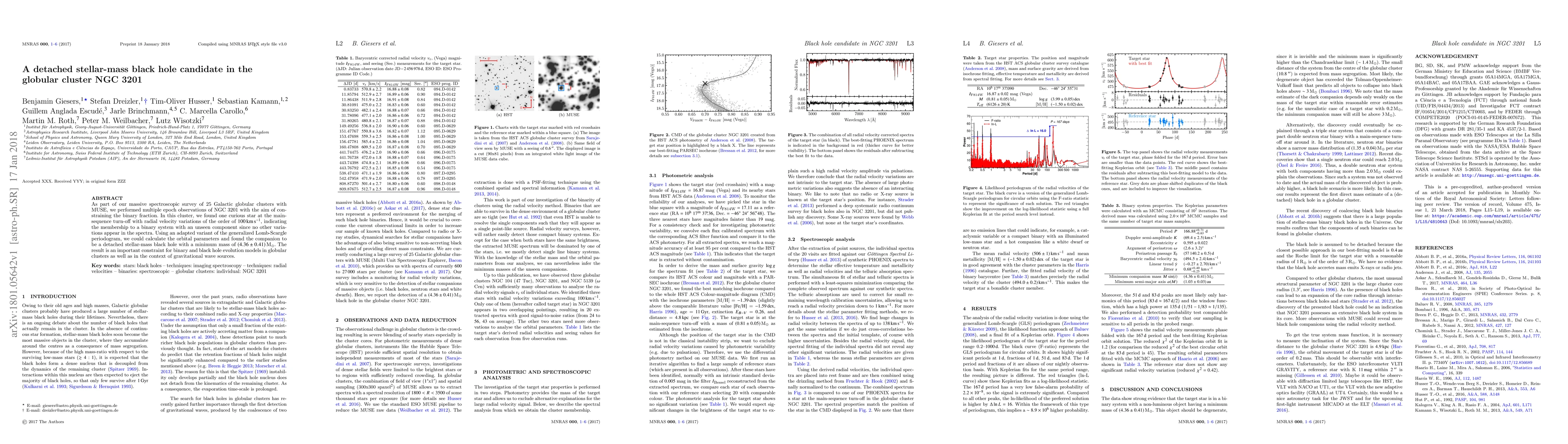 As part of our massive spectroscopic survey of 25 Galactic globular clusters with MUSE, we performed multiple epoch observations of NGC 3201 with the aim of constraining the binary fraction. In this cluster, we found one curious star at the main-sequence turn-off with radial velocity variations of the order of 100 km/s, indicating the membership to a binary system with an unseen component since no other variations appear in the spectra. Using an adapted variant of the generalized Lomb-Scargle periodogram, we could calculate the orbital parameters and found the companion to be a detached stellar-mass black hole with a minimum mass of 4.36 $\pm$ 0.41 solar masses. The result is an important constraint for binary and black hole evolution models in globular clusters as well as in the context of gravitational wave sources.