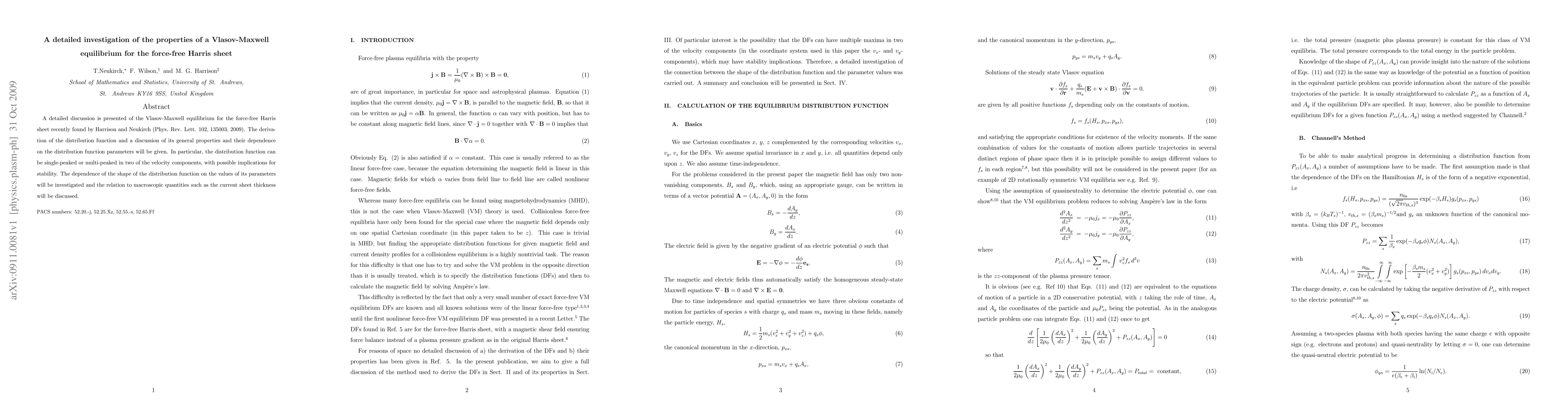 This paper investigates the Vlasov-Maxwell equilibrium for the force-free Harris sheet, deriving a distribution function that can be single- or multi-peaked in velocity components, potentially affecting stability. The study explores the distribution function's dependence on parameters and its relation to macroscopic quantities like current sheet thickness.
