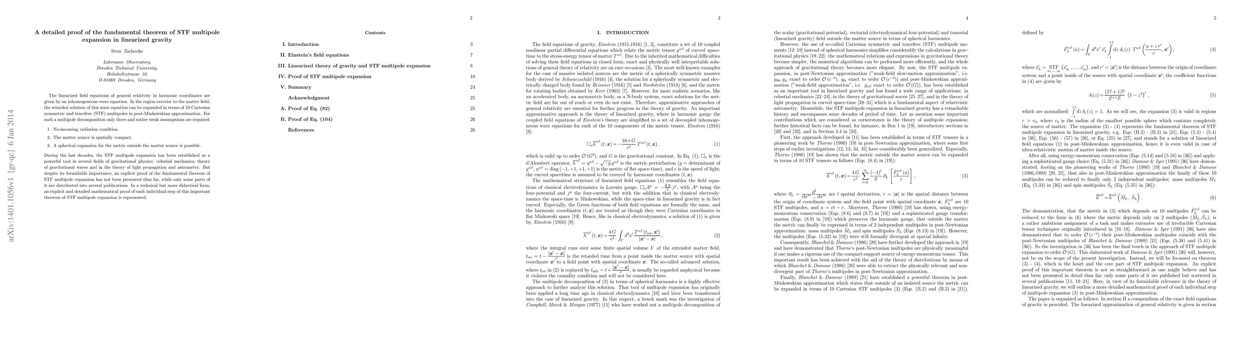 The linearized field equations of general relativity in harmonic coordinates are given by an inhomogeneous wave equation. In the region exterior to the matter field, the retarded solution of this wave equation can be expanded in terms of 10 Cartesian symmetric and tracefree (STF) multipoles in post-Minkowskian approximation. For such a multipole decomposition only three and rather weak assumptions are required: 1. No-incoming radiation condition. 2. The matter source is spatially compact. 3. A spherical expansion for the metric outside the matter source is possible. During the last decades, the STF multipole expansion has been established as a powerful tool in several fields of gravitational physics: celestial mechanics, theory of gravitational waves and in the theory of light propagation and astrometry. But despite its formidable importance, an explicit proof of the fundamental theorem of STF multipole expansion has not been presented thus far, while only some parts of it are distributed into several publications. In a technical but more didactical form, an explicit and detailed mathematical proof of each individual step of this important theorem of STF multipole expansion is represented.