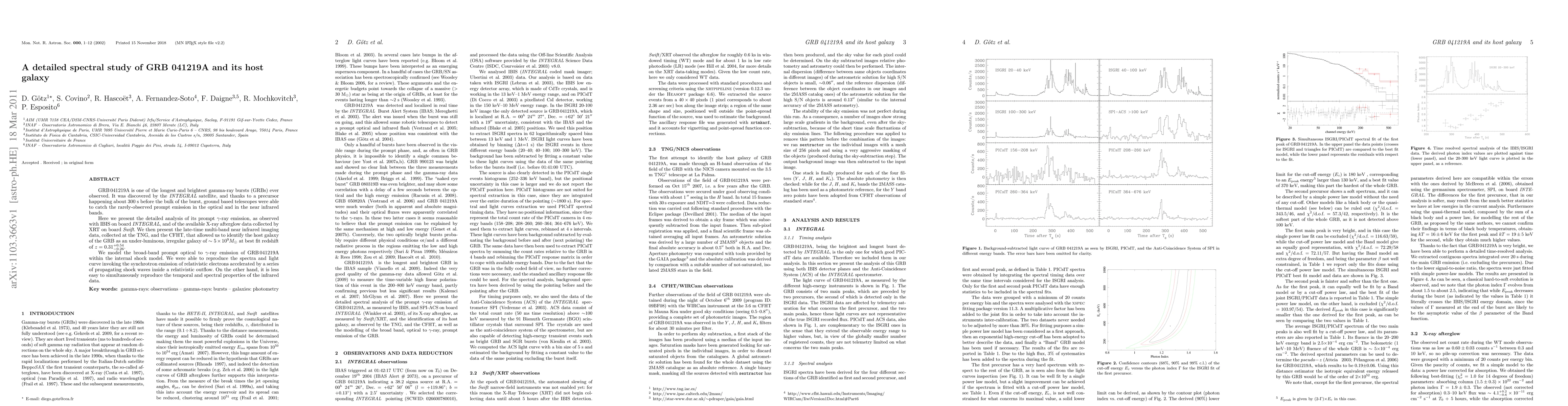 GRB 041219A is one of the longest and brightest gamma-ray bursts (GRBs) ever observed. It was discovered by the INTEGRAL satellite, and thanks to a precursor happening about 300 s before the bulk of the burst, ground based telescopes were able to catch the rarely-observed prompt emission in the optical and in the near infrared bands. Here we present the detailed analysis of its prompt gamma-ray emission, as observed with IBIS on board INTEGRAL, and of the available X-ray afterglow data collected by XRT on board Swift. We then present the late-time multi-band near infrared imaging data, collected at the TNG, and the CFHT, that allowed us to identify the host galaxy of the GRB as an under-luminous, irregular galaxy of about 5x10^9 M_Sun at best fit redshift of z=0.31 -0.26 +0.54. We model the broad-band prompt optical to gamma-ray emission of GRB 041219A within the internal shock model. We were able to reproduce the spectra and light curve invoking the synchrotron emission of relativistic electrons accelerated by a series of propagating shock waves inside a relativistic outflow. On the other hand, it is less easy to simultaneously reproduce the temporal and spectral properties of the infrared data.