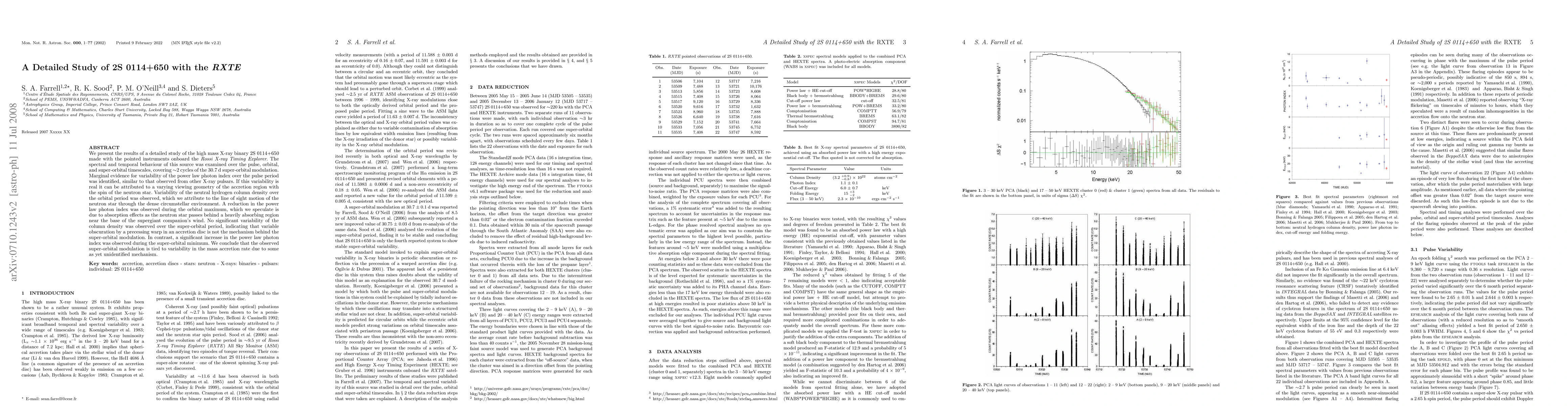 We present the results of a detailed study of the high mass X-ray binary 2S 0114+650 made with the pointed instruments onboard the Rossi X-ray Timing Explorer. The spectral and temporal behaviour of this source was examined over the pulse, orbital, and super-orbital timescales, covering $\sim$2 cycles of the 30.7 d super-orbital modulation. Marginal evidence for variability of the power law photon index over the pulse period was identified, similar to that observed from other X-ray pulsars. If this variability is real it can be attributed to a varying viewing geometry of the accretion region with the spin of the neutron star. Variability of the neutral hydrogen column density over the orbital period was observed, which we attribute to the line of sight motion of the neutron star through the dense circumstellar environment. A reduction in the power law photon index was observed during the orbital maximum, which we speculate is due to absorption effects as the neutron star passes behind a heavily absorbing region near the base of the supergiant companion's wind. No significant variability of the column density was observed over the super-orbital period, indicating that variable obscuration by a precessing warp in an accretion disc is not the mechanism behind the super-orbital modulation. In contrast, a significant increase in the power law photon index was observed during the super-orbital minimum. We conclude that the observed super-orbital modulation is tied to variability in the mass accretion rate due to some as yet unidentified mechanism.