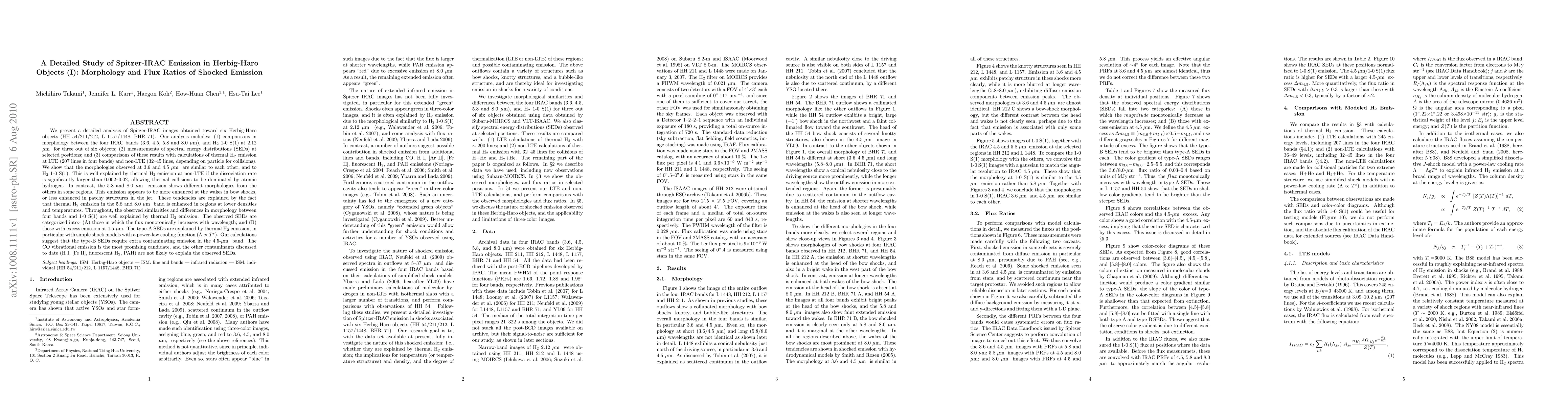 We present a detailed analysis of Spitzer-IRAC images obtained toward six Herbig-Haro objects (HH 54/211/212, L 1157/1448, BHR 71). Our analysis includes: (1) comparisons in morphology between the four IRAC bands (3.6, 4.5, 5.8 and 8.0 um), and H2 1-0 S(1) at 2.12 um for three out of six objects; (2) measurements of spectral energy distributions (SEDs) at selected positions; and (3) comparisons of these results with calculations of thermal H2 emission at LTE (207 lines in four bands) and non-LTE (32-45 lines, depending on particle for collisions). We show that the morphologies observed at 3.6 and 4.5 um are similar to each other, and to H2 1-0 S(1). This is well explained by thermal H2 emission at non-LTE if the dissociation rate is significantly larger than 0.002-0.02, allowing thermal collisions to be dominated by atomic hydrogen. In contrast, the 5.8 and 8.0 um emission shows different morphologies from the others in some regions. This emission appears to be more enhanced at the wakes in bow shocks, or less enhanced in patchy structures in the jet. These tendencies are explained by the fact that thermal H2 emission in the 5.8 and 8.0 um band is enhanced in regions at lower densities and temperatures. Throughout, the observed similarities and differences in morphology between four bands and 1-0 S(1) are well explained by thermal H2 emission. The observed SEDs are categorized into:- (A) those in which the flux monotonically increases with wavelength; and (B) those with excess emission at 4.5-um. The type-A SEDs are explained by thermal H2 emission, in particular with simple shock models with a power-law cooling function. Our calculations suggest that the type-B SEDs require extra contaminating emission in the 4.5-um band. The CO vibrational emission is the most promising candidate, and the other contaminants discussed to date are not likely to explain the observed SEDs.
