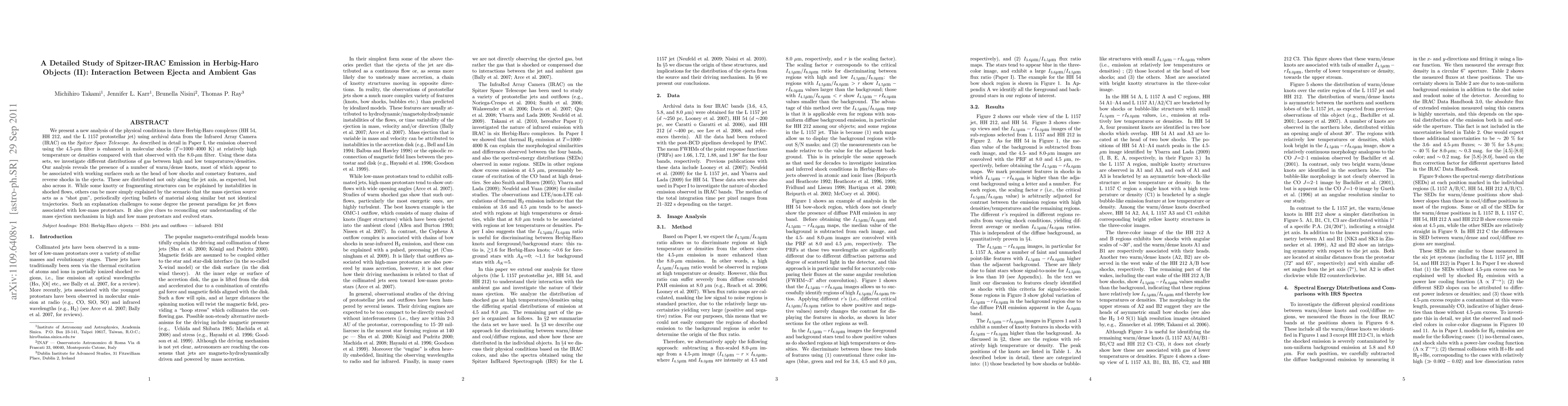 We present a new analysis of the physical conditions in three Herbig-Haro complexes (HH 54, HH 212, and the L 1157 protostellar jet) using archival data from the Infrared Array Camera (IRAC) on the Spitzer Space Telescope. As described in detail in Paper I, the emission observed using the 4.5-micron filter is enhanced in molecular shocks (T=1000-4000 K) at relatively high temperature or densities compared with that observed with the 8.0-micron filter. Using these data sets, we investigate different distributions of gas between high and low temperatures/densities. Our analysis reveals the presence of a number of warm/dense knots, most of which appear to be associated with working surfaces such as the head of bow shocks and cometary features, and reverse shocks in the ejecta. These are distributed not only along the jet axis, as expected, but also across it. While some knotty or fragmenting structures can be explained by instabilities in shocked flows, others can be more simply explained by the scenario that the mass ejection source acts as a "shot gun", periodically ejecting bullets of material along similar but not identical trajectories. Such an explanation challenges to some degree the present paradigm for jet flows associated with low-mass protostars. It also give clues to reconciling our understanding of the mass ejection mechanism in high and low mass protostars and evolved stars.