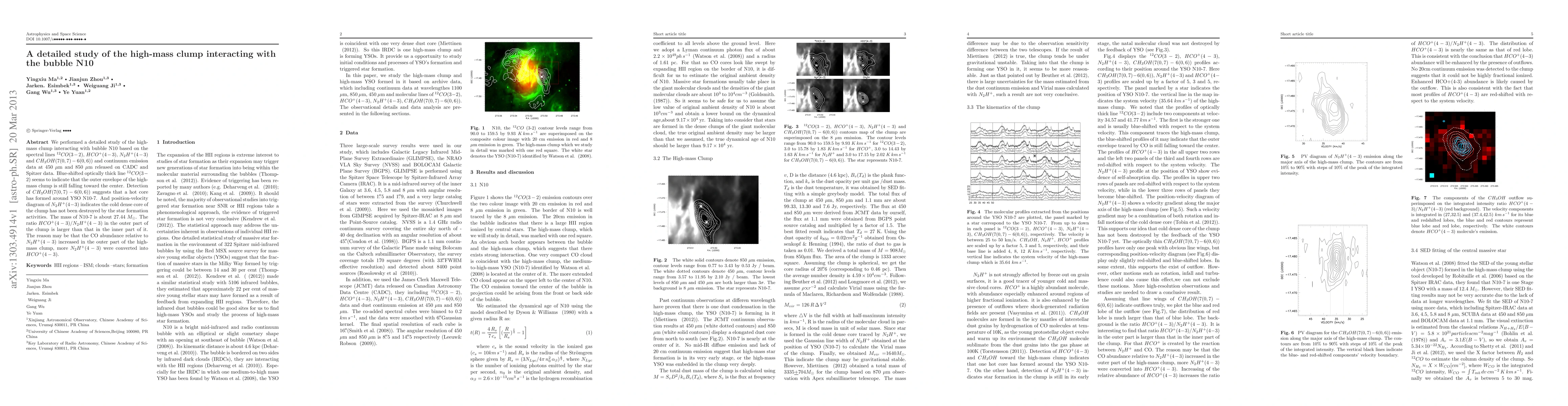 We performed a detailed study of the high-mass clump interacting with bubble N10 based on the spectral lines $^{12}CO(3-2)$, $HCO^+(4-3)$, $N_2H^+(4-3)$ and $CH_3OH(7(0,7)-6(0,6))$ and continuum emission data at 450 $\mu$m and 850 $\mu$m released on CADC and Spitzer data. Blue-shifted optically thick line $^{12}CO (3-2)$ seems to indicate that the outer envelope of the high-mass clump is still falling toward the center. Detection of $CH_3OH(7(0,7)-6(0,6))$ suggests that a hot core has formed around YSO N10-7. And position-velocity diagram of $N_2H^+ (4-3)$ indicates the cold dense core of the clump has not been destroyed by the star formation activities. The mass of N10-7 is about 27.44 $M_\odot$. The ratio $HCO^+(4-3)/N_2H^+ (4-3)$ in the outer part of the clump is larger than that in the inner part of it. The reason may be that the CO abundance relative to $N_2H^+ (4-3)$ increased in the outer part of the high-mass clump, more $N_2H^+ (4-3)$ were converted into $HCO^+(4-3)$.