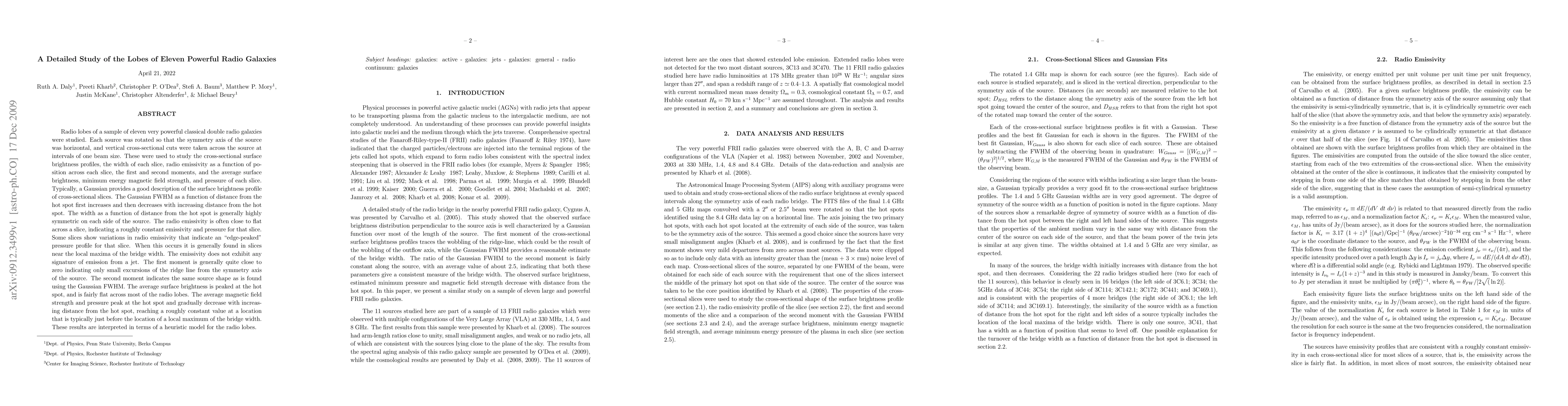 Radio lobes of a sample of eleven very powerful classical double radio galaxies were studied. Each source was rotated so that the symmetry axis of the source was horizontal, and vertical cross-sectional cuts were taken across the source at intervals of one beam size. These were used to study the cross-sectional surface brightness profiles, the width of each slice, radio emissivity as a function of position across each slice, the first and second moments, and the average surface brightness, minimum energy magnetic field strength, and pressure of each slice. A Gaussian provides a good description of the surface brightness profile of cross-sectional slices. The Gaussian FWHM as a function of distance from the hot spot first increases and then decreases with distance from the hot spot. The width as a function of distance from the hot spot is highly symmetric on each side of the source. The radio emissivity is often close to flat across a slice, indicating a roughly constant emissivity and pressure for that slice. Some slices show variations in radio emissivity that indicate an ``edge-peaked'' pressure profile for that slice; these often occur in slices near the local maxima of the bridge width. The emissivity does not exhibit any signature of emission from a jet. The first moment is generally quite close to zero indicating only small excursions of the ridge line from the symmetry axis of the source. The second moment indicates the same source shape as is found using the Gaussian FWHM. The average magnetic field strength and pressure decrease with increasing distance from the hot spot, reaching a roughly constant value at a location that is typically just before the location of a local maximum of the bridge width. These results are interpreted in terms of a heuristic model for the radio lobes.