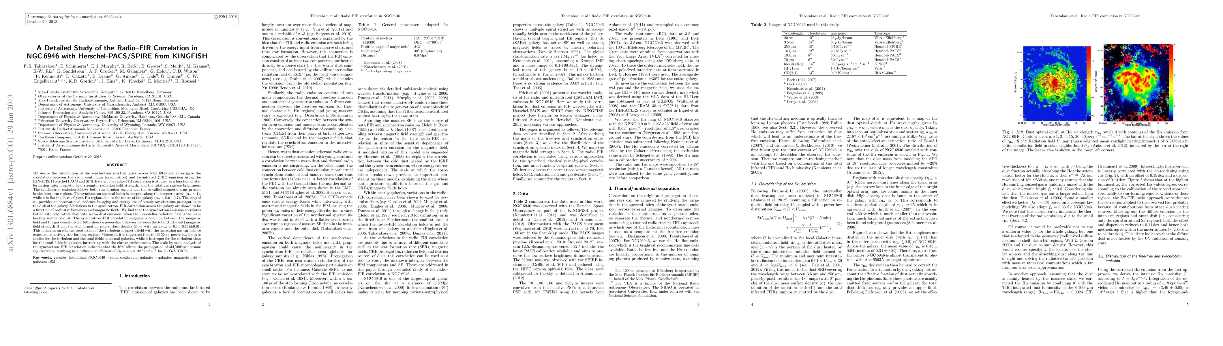 This study examines the correlation between radio continuum (synchrotron) and far-infrared (FIR) emission in NGC6946 using Herschel data. Key findings include variations in the synchrotron spectral index across the galaxy, revealing aging cosmic ray electrons. The synchrotron emission correlates better with cold dust, indicating a coupling between magnetic fields and gas density. A power-law relationship is observed between magnetic field strength and star formation rate surface density, suggesting efficient magnetic field production in star-forming regions. The diffusion coefficient for cosmic ray electrons is estimated at 4.6×10²⁸ cm² s⁻¹ for 2.2 GeV electrons.