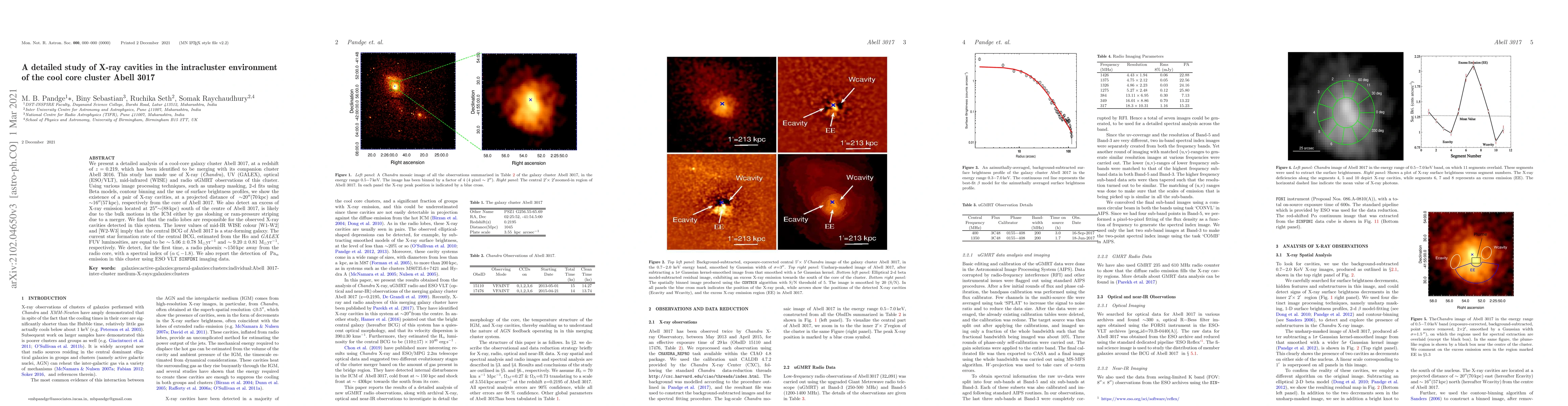 We present a detailed analysis of a cool-core galaxy cluster Abell 3017, at a redshift of z=0.219, which has been identified to be merging with its companion cluster Abell 3016. This study has made use of X-ray Chandra, UV (GALEX), optical (ESO/VLT), mid-infrared (WISE), and radio uGMRT observations of this cluster. Using various image processing techniques, such as unsharp masking, 2-d fits using Beta models, contour binning and the use of surface brightness profiles, we show the existence of a pair of X-ray cavities, at a projected distance of $\sim$20'' (70 kpc) and $\sim$16'' (57 kpc), respectively from the core of Abell~3017. We also detect an excess of X-ray emission located at 25'' $\sim$(88 kpc) south of the centre of Abell 3017, is likely due to the bulk motions in the ICM either by gas sloshing or ram-pressure striping due to a merger. We find that the radio lobes are responsible for the observed X-ray cavities detected in this system. The lower values of the mid-IR WISE colour [W1-W2] and [W2-W3] imply that the central BCG of Abell~3017 is a star-forming galaxy. The current star formation rate of the central BCG, estimated from the ${\rm H\alpha}$ and GALEX FUV luminosities, are equal to be $\sim 5.06\pm 0.78$ Msun yr$^{-1}$ and $\sim 9.20\pm 0.81$ Msun yr$^{-1}$, respectively. We detect, for the first time, a radio phoenix $\sim$150 kpc away from the radio core, with a spectral index of ($\alpha \!\leq\! -1.8$). We also report the detection of $\rm~Pa_\alpha$ emission in this cluster using ESO VLT SINFONI imaging data.