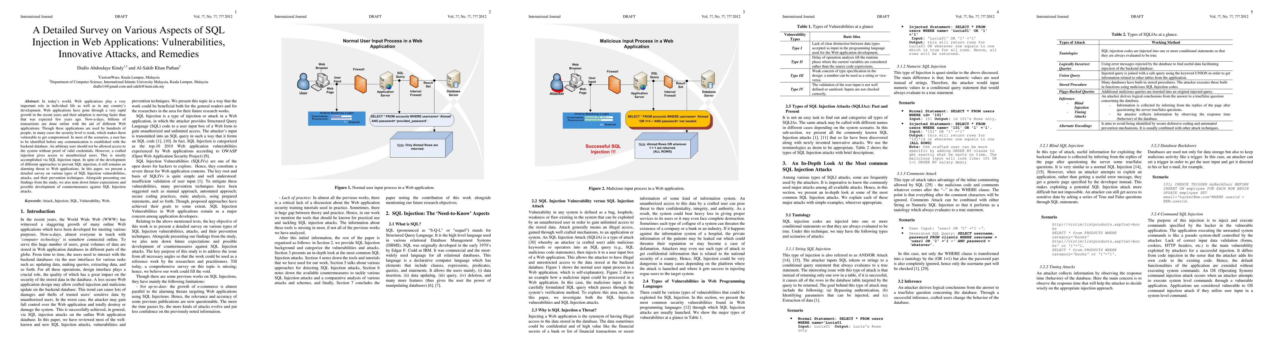 This paper provides a comprehensive survey on SQL Injection vulnerabilities in web applications, detailing various attack types and innovative methods used. It also explores effective prevention techniques and discusses future directions for developing countermeasures against these persistent threats.