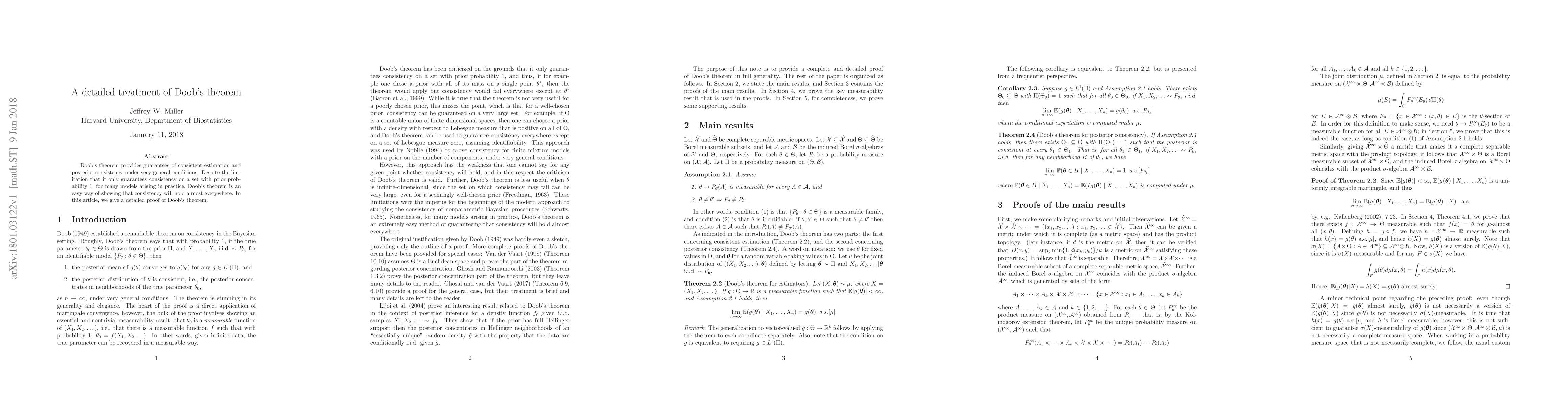Doob's theorem provides guarantees of consistent estimation and posterior consistency under very general conditions. Despite the limitation that it only guarantees consistency on a set with prior probability 1, for many models arising in practice, Doob's theorem is an easy way of showing that consistency will hold almost everywhere. In this article, we give a detailed proof of Doob's theorem.