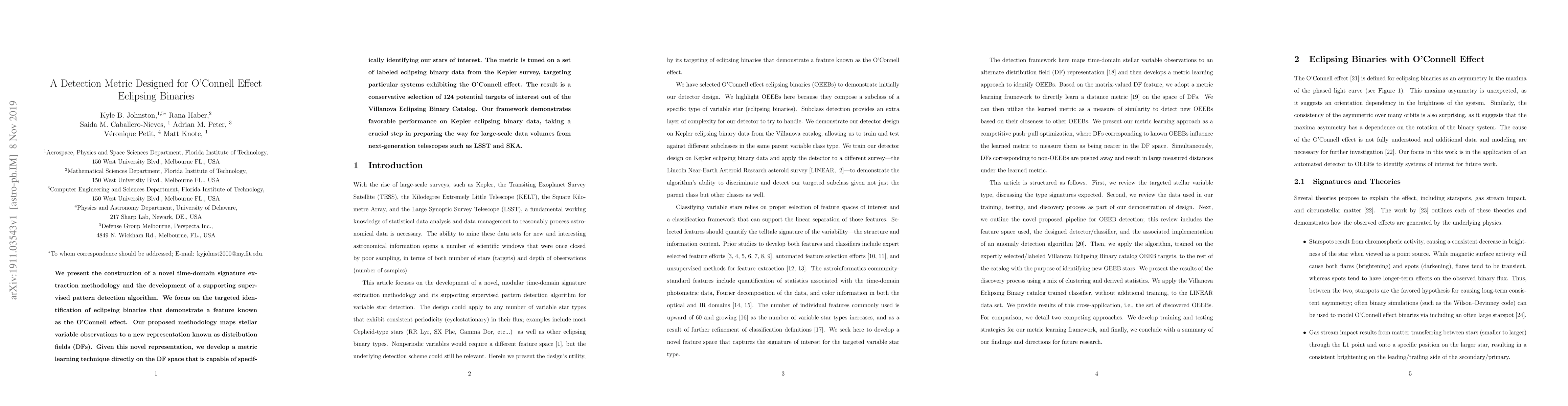 We present the construction of a novel time-domain signature extraction methodology and the development of a supporting supervised pattern detection algorithm. We focus on the targeted identification of eclipsing binaries that demonstrate a feature known as the O'Connell effect. Our proposed methodology maps stellar variable observations to a new representation known as distribution fields (DFs). Given this novel representation, we develop a metric learning technique directly on the DF space that is capable of specifically identifying our stars of interest. The metric is tuned on a set of labeled eclipsing binary data from the Kepler survey, targeting particular systems exhibiting the O'Connell effect. The result is a conservative selection of 124 potential targets of interest out of the Villanova Eclipsing Binary Catalog. Our framework demonstrates favorable performance on Kepler eclipsing binary data, taking a crucial step in preparing the way for large-scale data volumes from next-generation telescopes such as LSST and SKA.