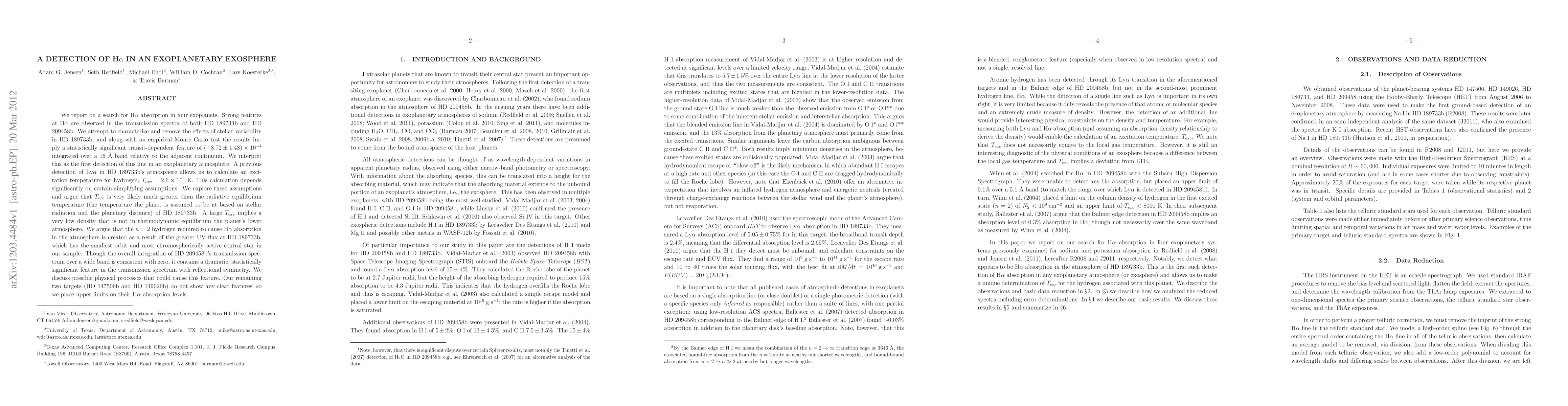 We report on a search for H-alpha absorption in four exoplanets. Strong features at H-alpha are observed in the transmission spectra of both HD 189733b and HD 209458b. We attempt to characterize and remove the effects of stellar variability in HD 189733b, and along with an empirical Monte Carlo test the results imply a statistically significant transit-dependent feature of (-8.72+/-1.48)x10^-4 integrated over a 16 Angstrom band relative to the adjacent continuum. We interpret this as the first detection of this line in an exoplanetary atmosphere. A previous detection of Ly-alpha in HD 189733b's atmosphere allows us to calculate an excitation temperature for hydrogen, T_exc=2.6x10^4 K. This calculation depends significantly on certain simplifying assumptions. We explore these assumptions and argue that T_exc is very likely much greater than the radiative equilibrium temperature (the temperature the planet is assumed to be at based on stellar radiation and the planetary distance) of HD 189733b. A large T_exc implies a very low density that is not in thermodynamic equilibrium the planet's lower atmosphere. We argue that the n=2 hydrogen required to cause H-alpha absorption in the atmosphere is created as a result of the greater UV flux at HD 189733b, which has the smallest orbit and most chromospherically active central star in our sample. Though the overall integration of HD 209458b's transmission spectrum over a wide band is consistent with zero, it contains a dramatic, statistically significant feature in the transmission spectrum with reflectional symmetry. We discuss possible physical processes that could cause this feature. Our remaining two targets (HD 147506b and HD 149026b) do not show any clear features, so we place upper limits on their H-alpha absorption levels.