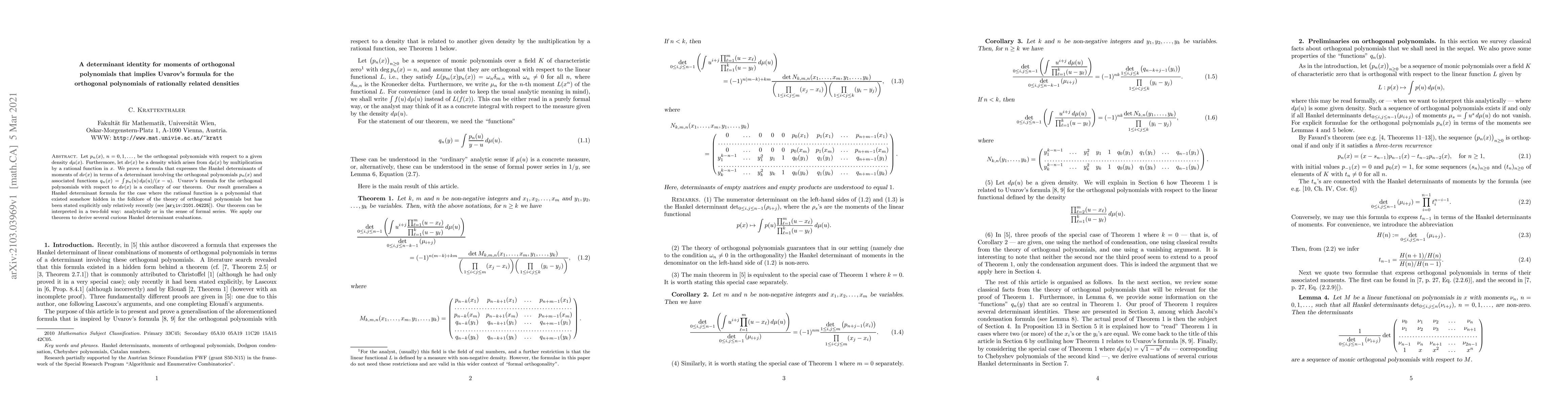 Let $p_n(x)$, $n=0,1,\dots$, be the orthogonal polynomials with respect to a given density $d\mu(x)$. Furthermore, let $d\nu(x)$ be a density which arises from $d\mu(x)$ by multiplication by a rational function in $x$. We prove a formula that expresses the Hankel determinants of moments of $d\nu(x)$ in terms of a determinant involving the orthogonal polynomials $p_n(x)$ and associated functions $q_n(x)=\int p_n(u) \,d\mu(u)/(x-u)$. Uvarov's formula for the orthogonal polynomials with respect to $d\nu(x)$ is a corollary of our theorem. Our result generalises a Hankel determinant formula for the case where the rational function is a polynomial that existed somehow hidden in the folklore of the theory of orthogonal polynomials but has been stated explicitly only relatively recently (see [arXiv:2101.04225]). Our theorem can be interpreted in a two-fold way: analytically or in the sense of formal series. We apply our theorem to derive several curious Hankel determinant evaluations.