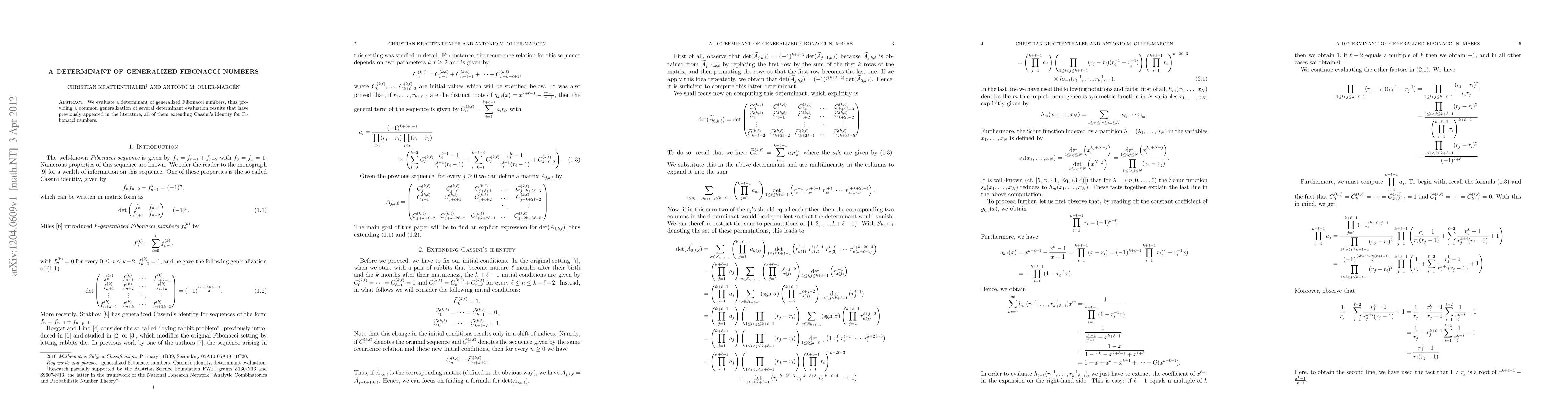 Summary: This paper evaluates the determinant of generalized Fibonacci numbers, unifying and extending previous results related to Cassini's identity for Fibonacci numbers. The findings offer a comprehensive generalization of determinant evaluations in this mathematical domain.