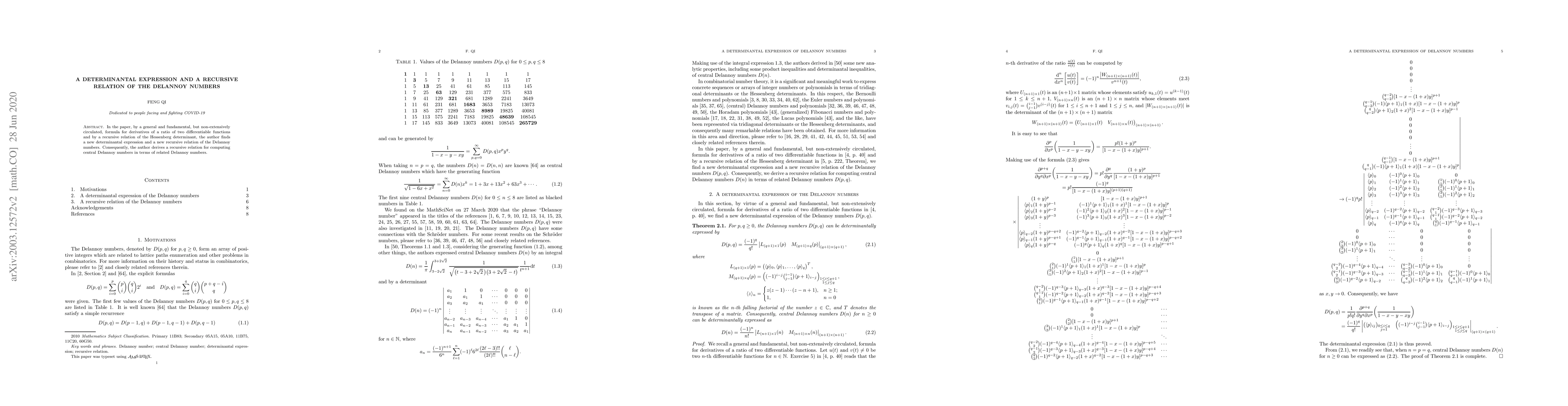 The paper introduces a determinantal expression and a recursive relation for Delannoy numbers using a novel formula for derivatives and the Hessenberg determinant. It also derives a recursive method for computing central Delannoy numbers from related values.